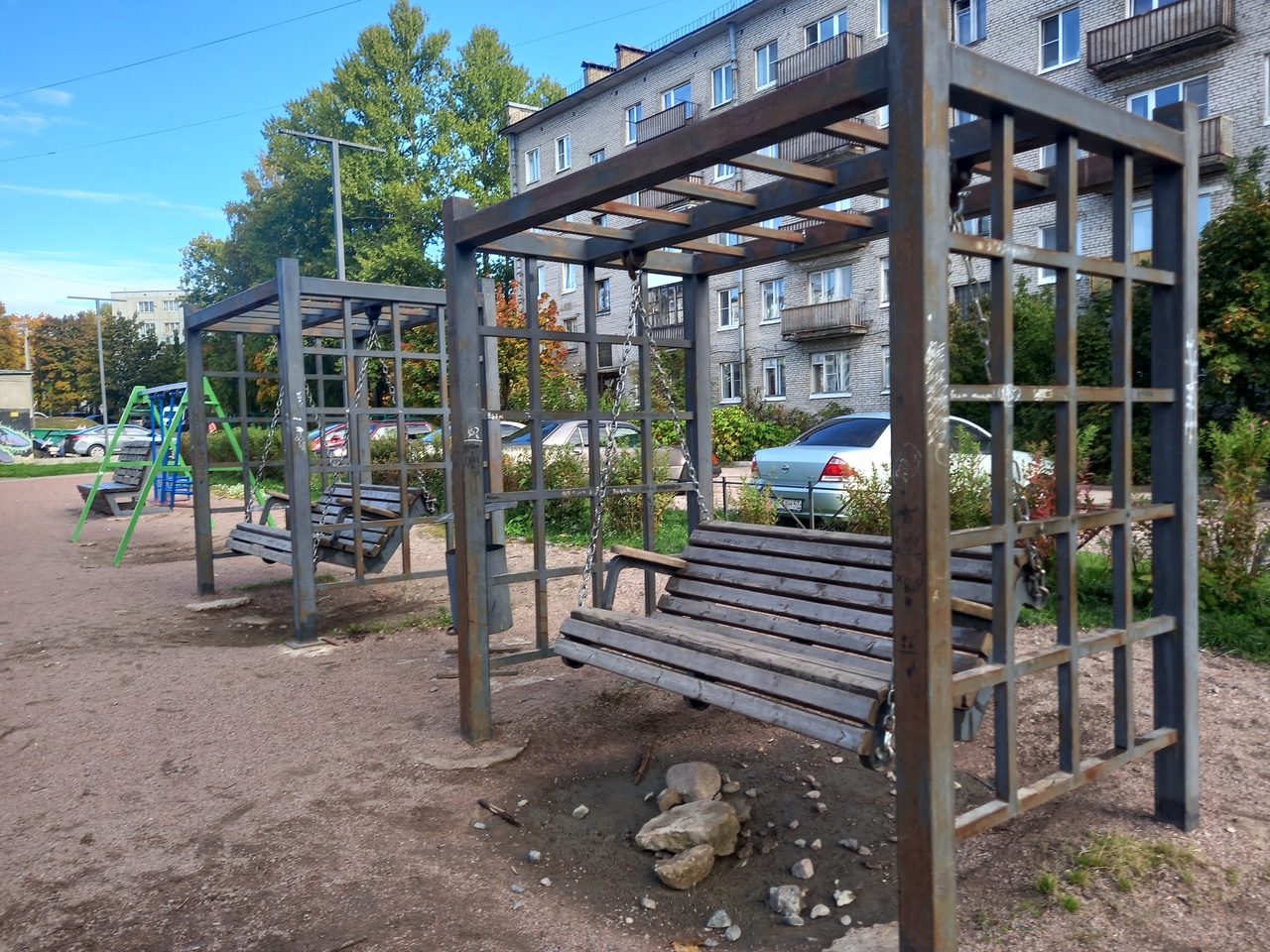 Качели. Их не красят, и они ржавеют. Один из наших ребят удивился, зачем по бокам решетка, - качаешься будто в клетке. Я думаю, это сделано, чтобы по ней могли лазать маленькие дети, пока качели заняты. Получается многофункциональная вещь.