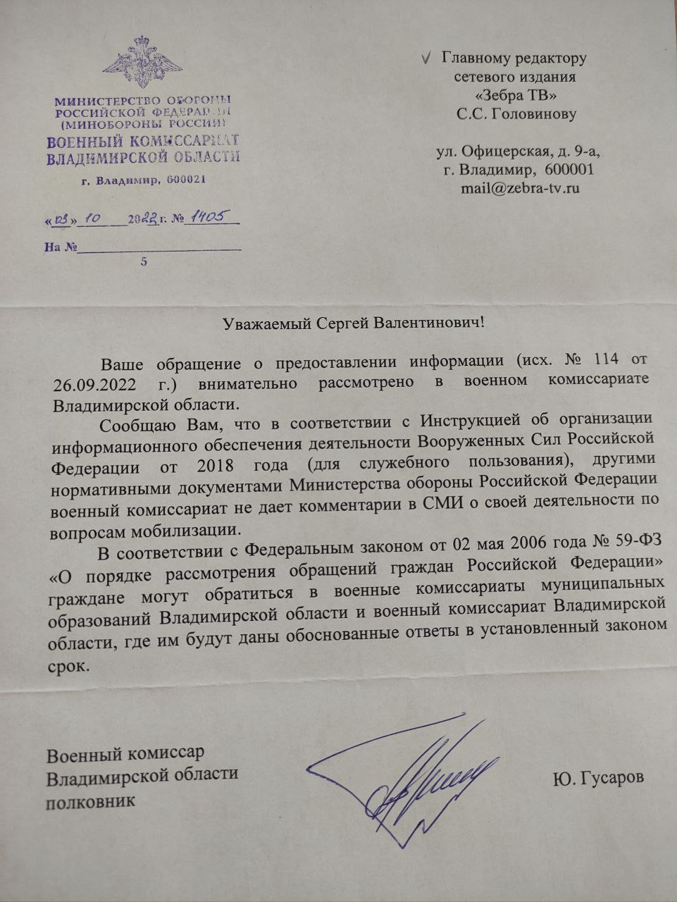 Законодательное Собрание Владимирской области, а также районные и городские советы народных депутатов отказались предоставлять информацию о депутатах, мобилизованных на войну в Украину. Они, как и другие чиновники, получают бронь, но могут добровольно от неё отказаться. Об этом сообщает «Зебра-ТВ» со ссылкой на официальные ответы властей на пресс-запросы.