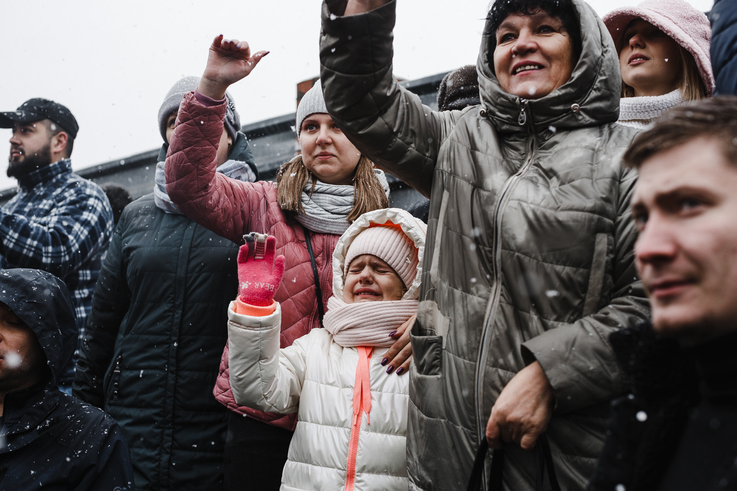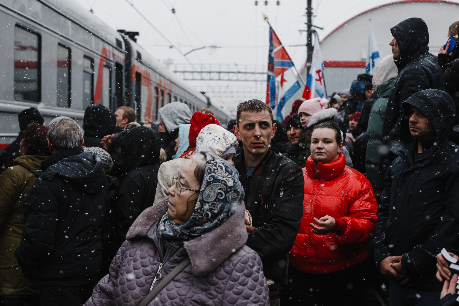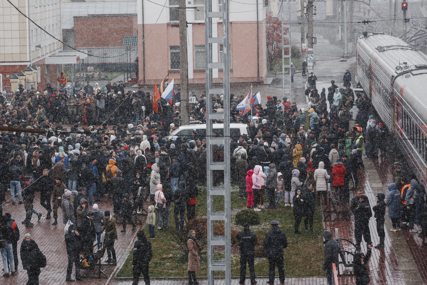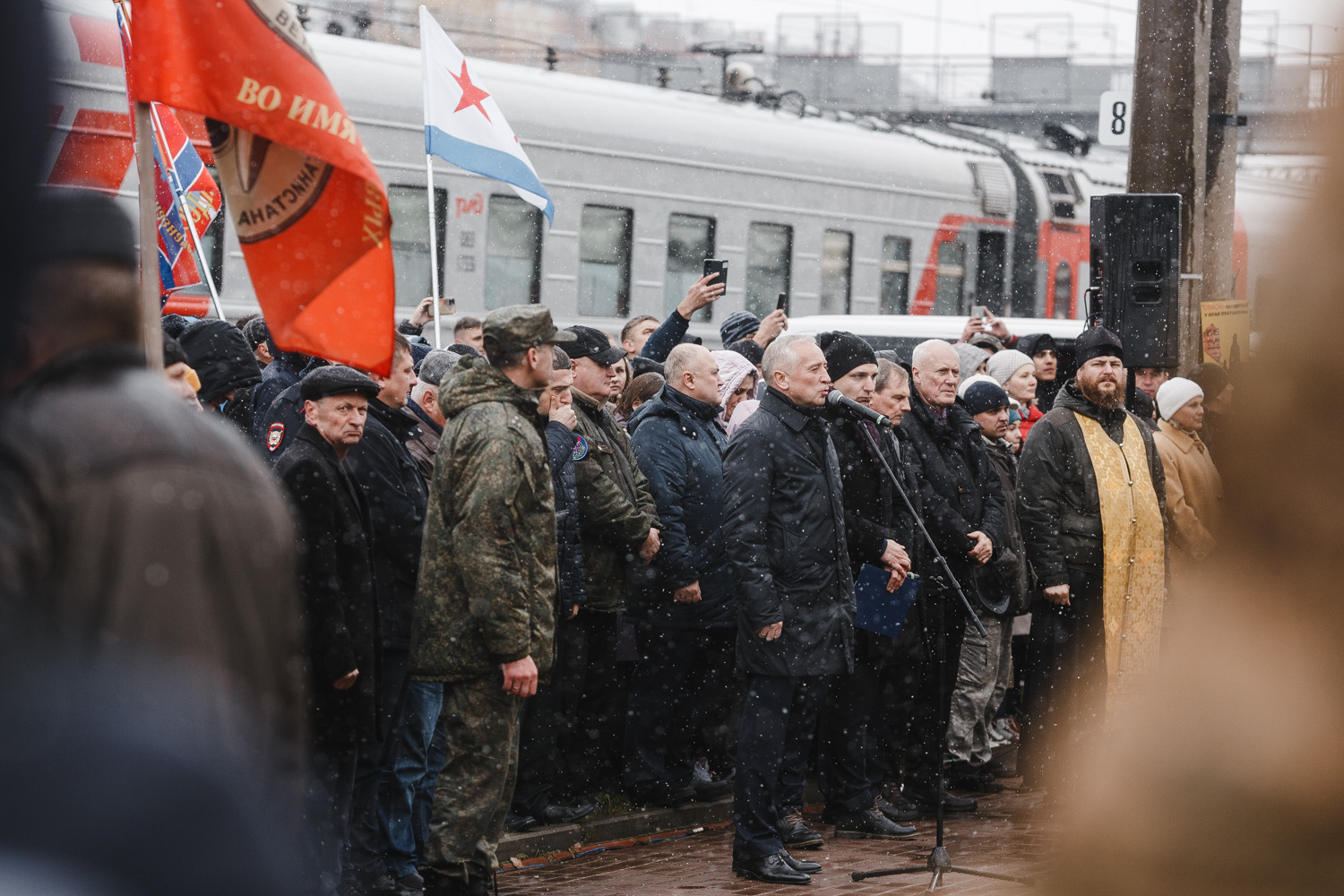 Перед призывниками выступают губернатор, а затем православный священник. Их речи провожающие слышат плохо – стоит гул, люди постоянно переговариваются, выискивая лица своих близких. Доносится выступление военного, который говорит о "борьбе с силами тьмы и нечистью: американцами и англосаксами, которые развязали третью мировую войну".