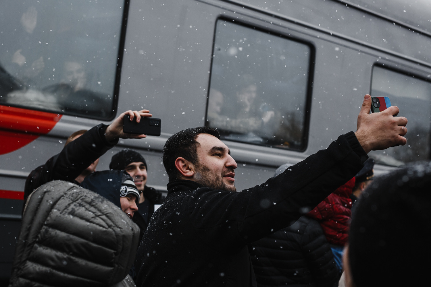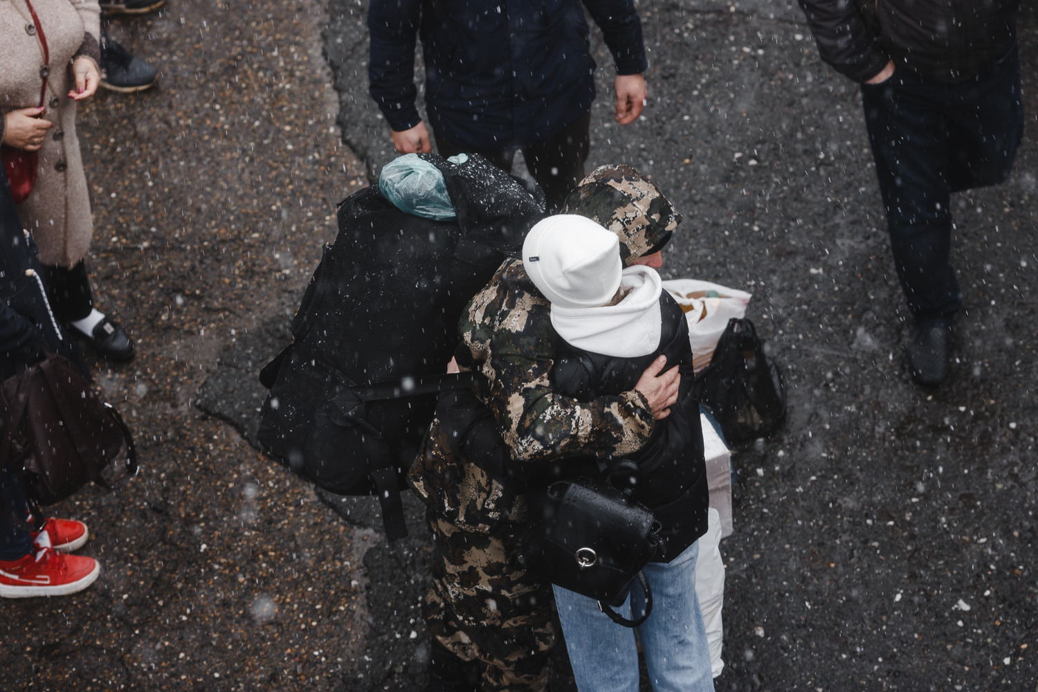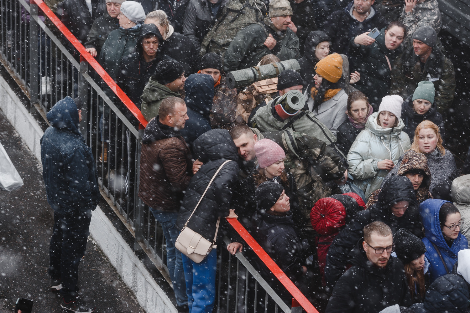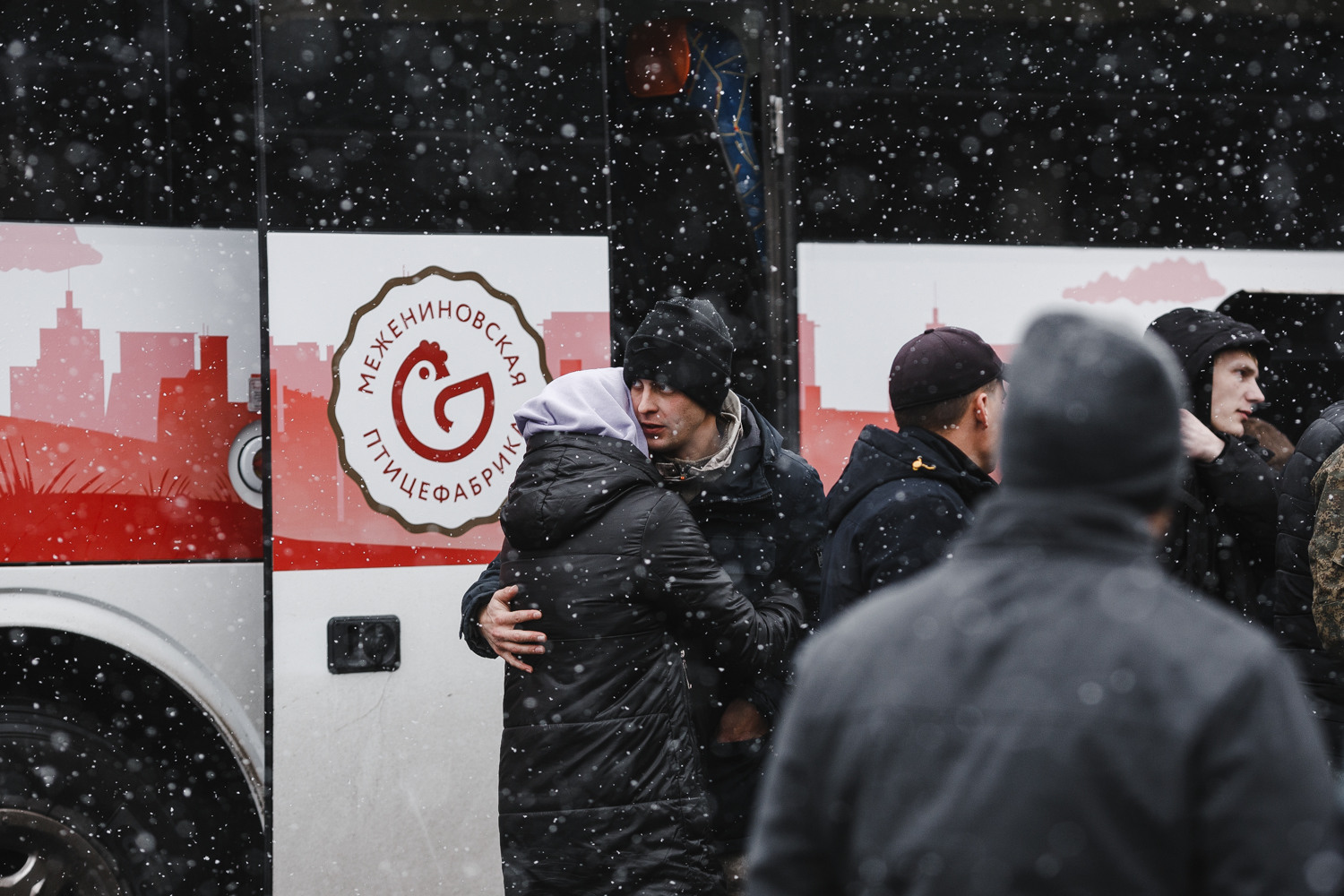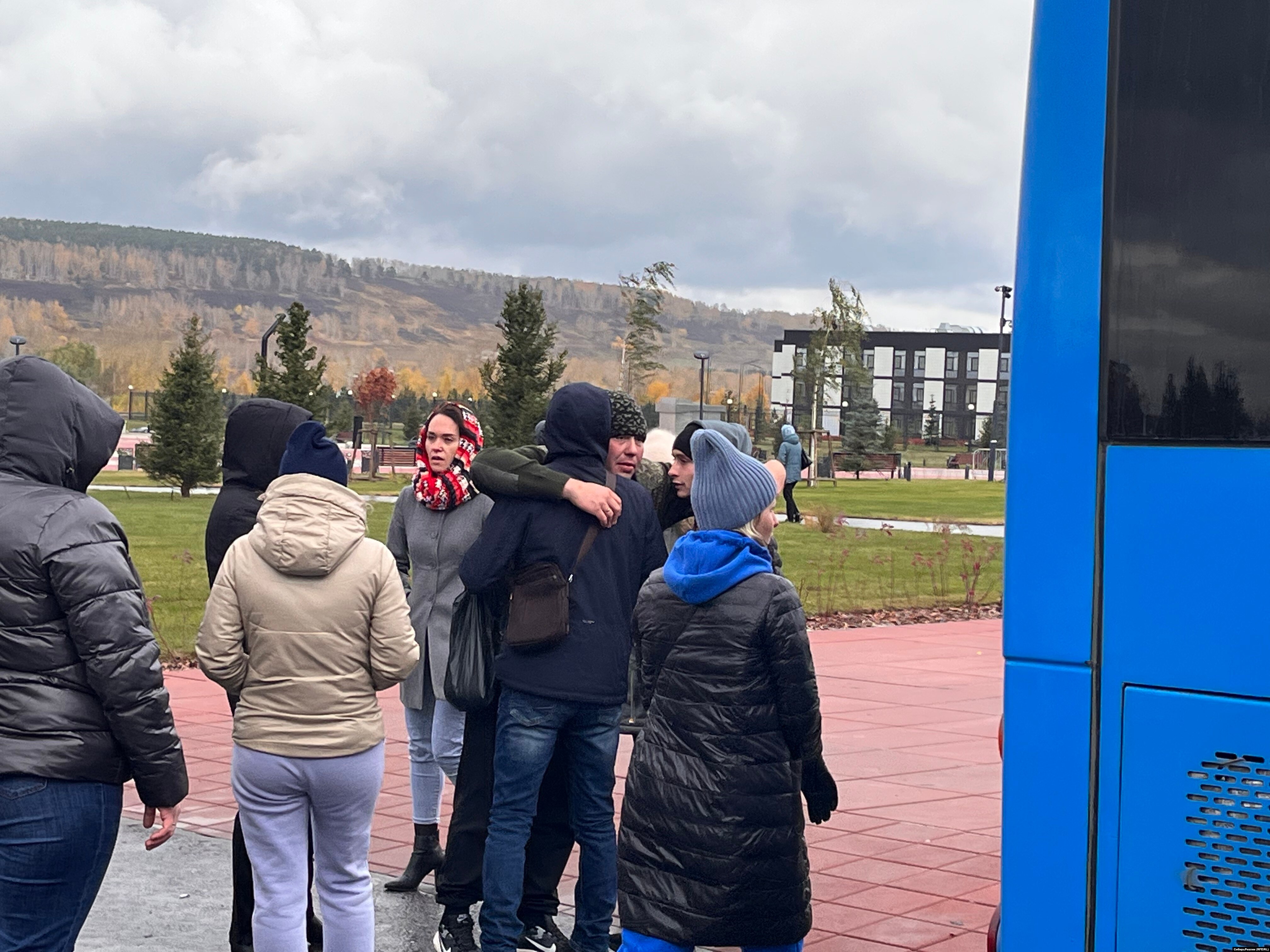 Затем полицейские убирают последний "кордон" между мобилизованными и провожающими, все понимают, что можно в последний раз перед отправлением обняться.