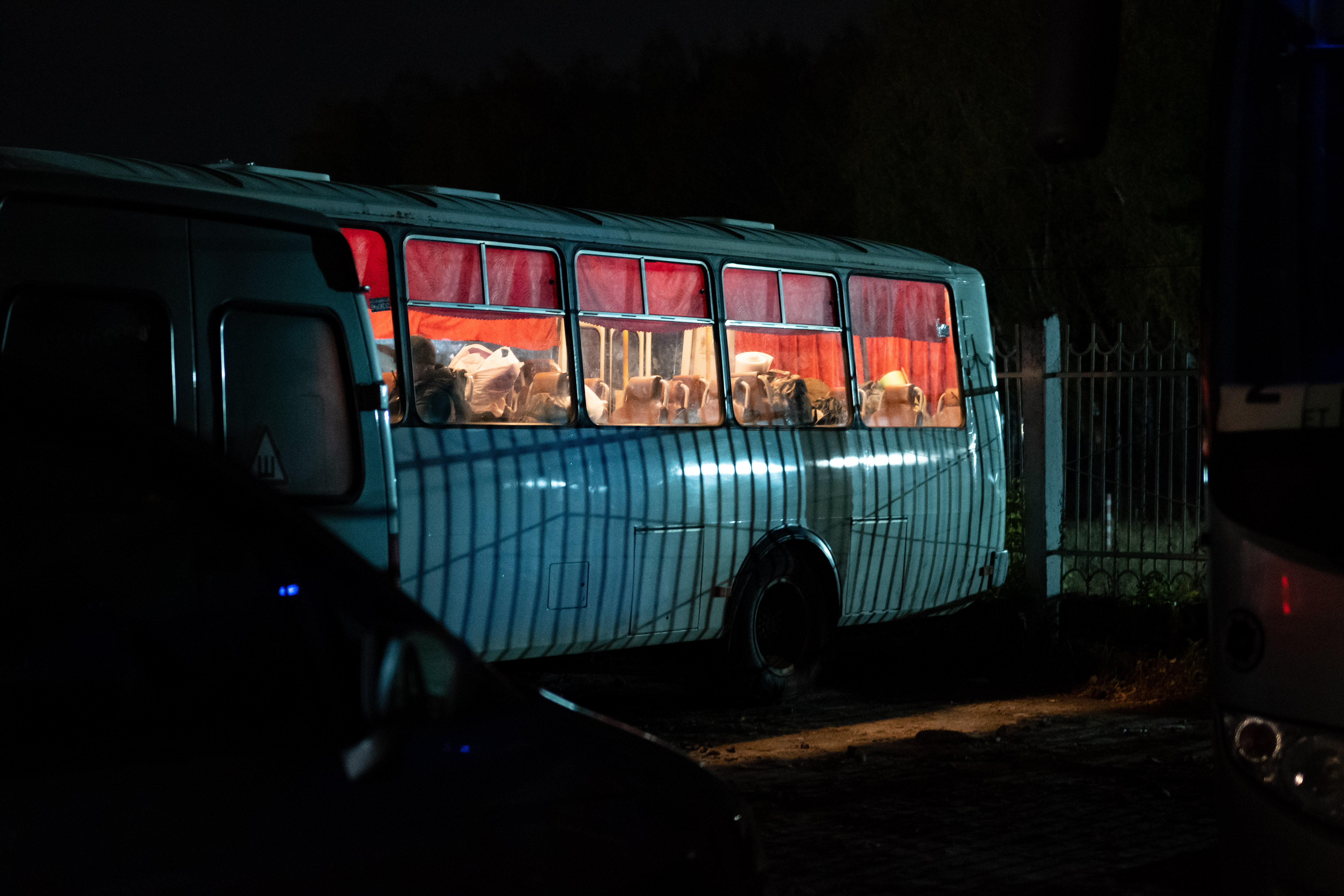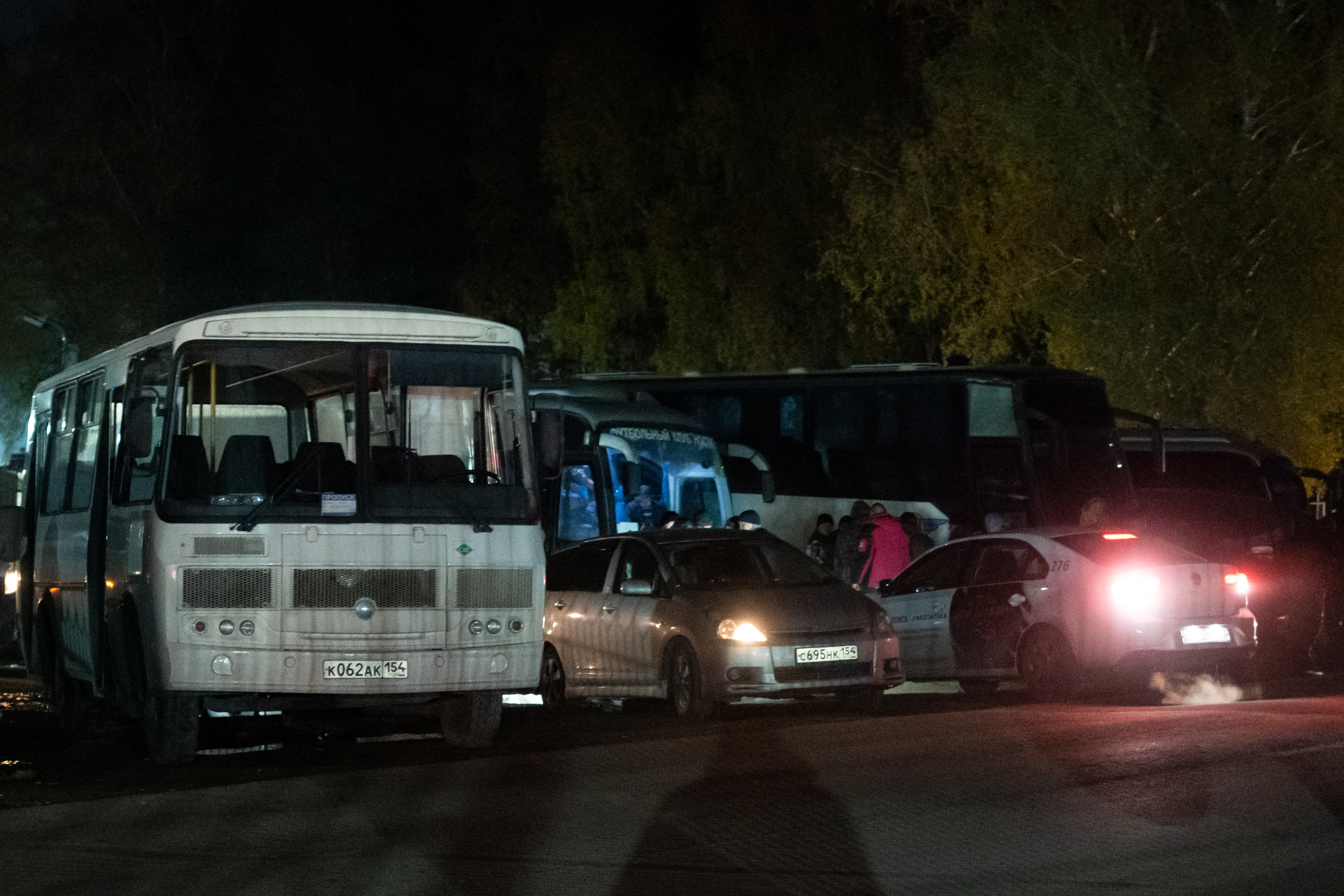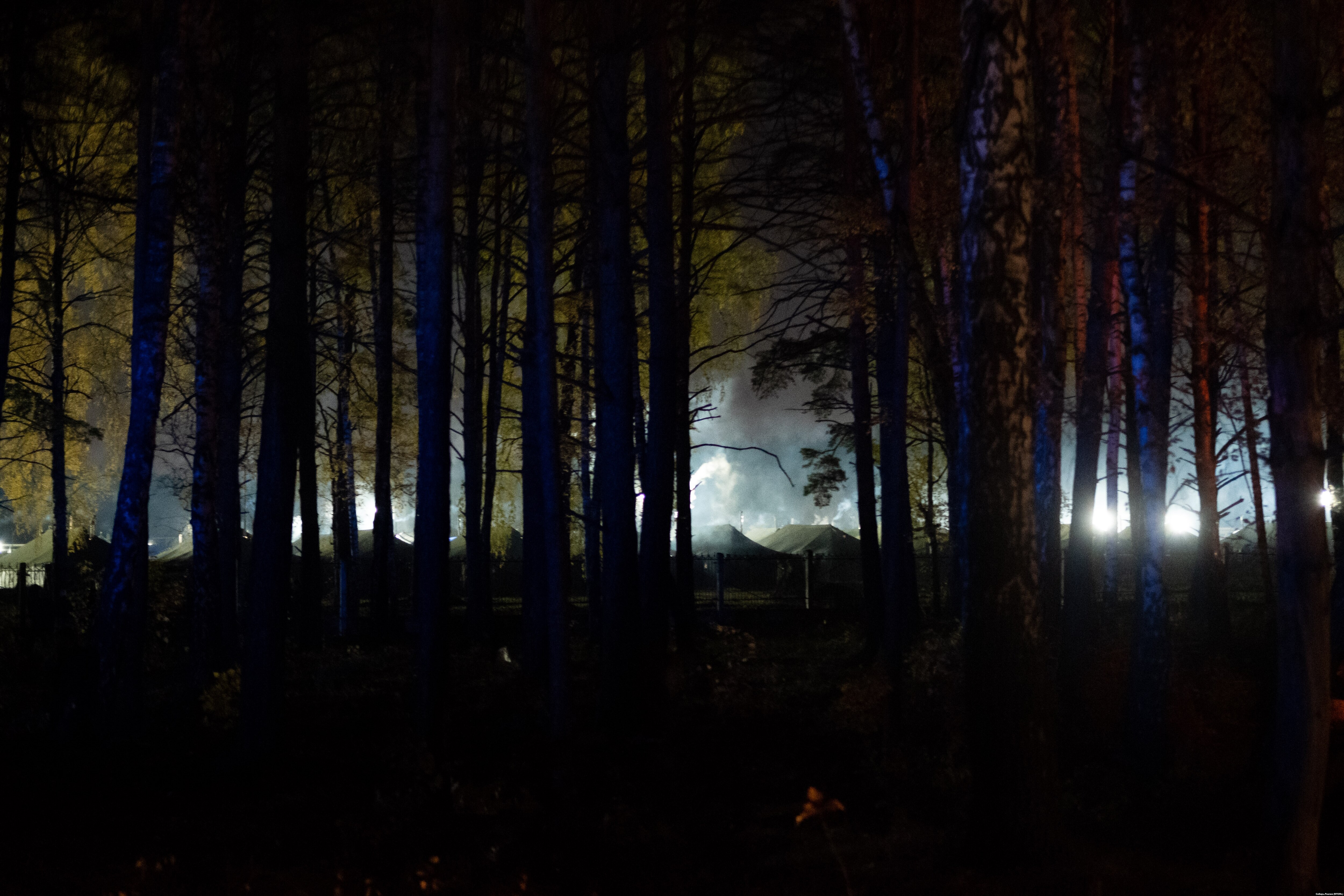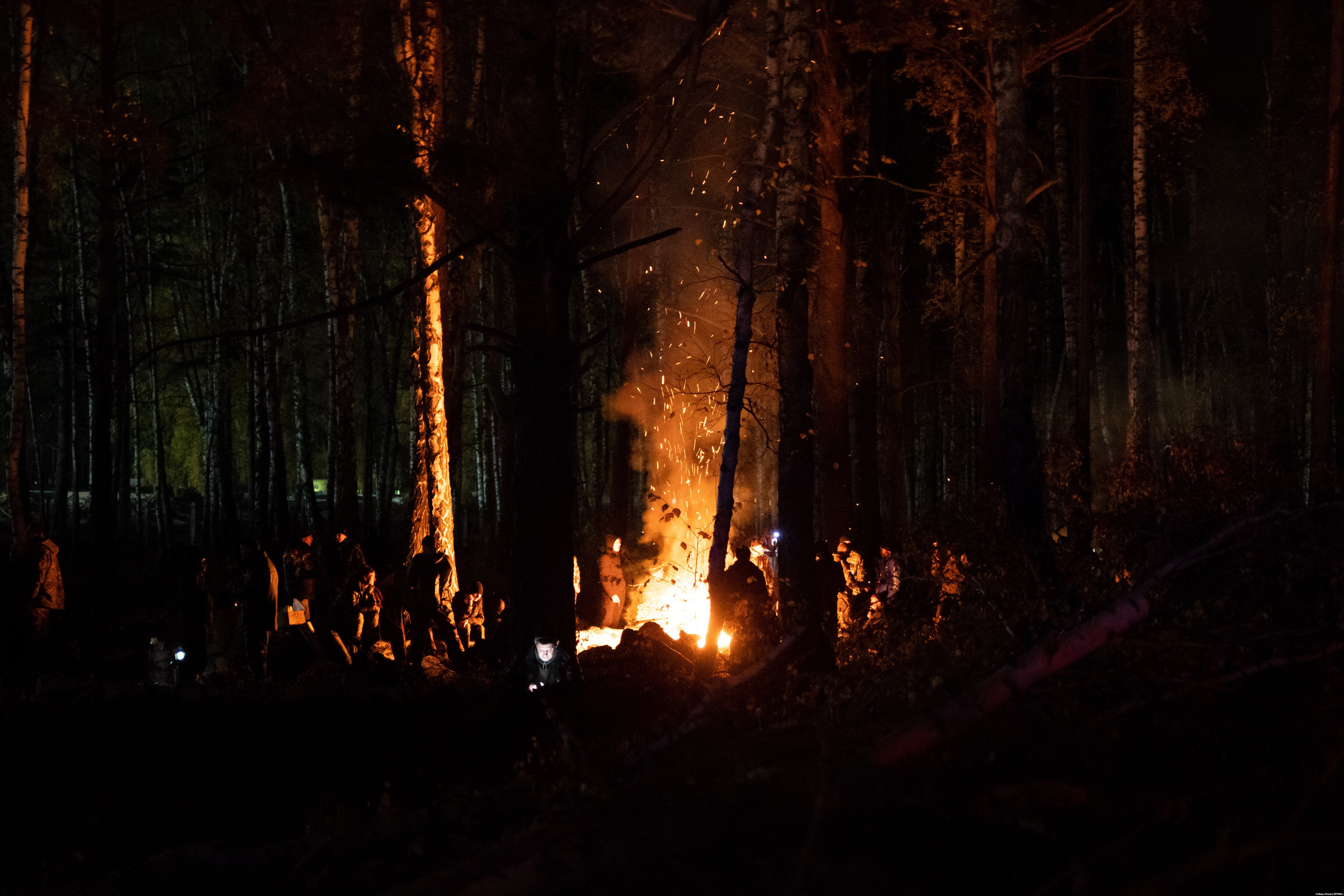 Но десятки мобилизованных продолжают терпеливо ждать своей очереди на заселение в училище, греясь у огня. Лес между дорогой и ограждением подсвечивается фарами, мигалками полицейских машин и большими кострами.
