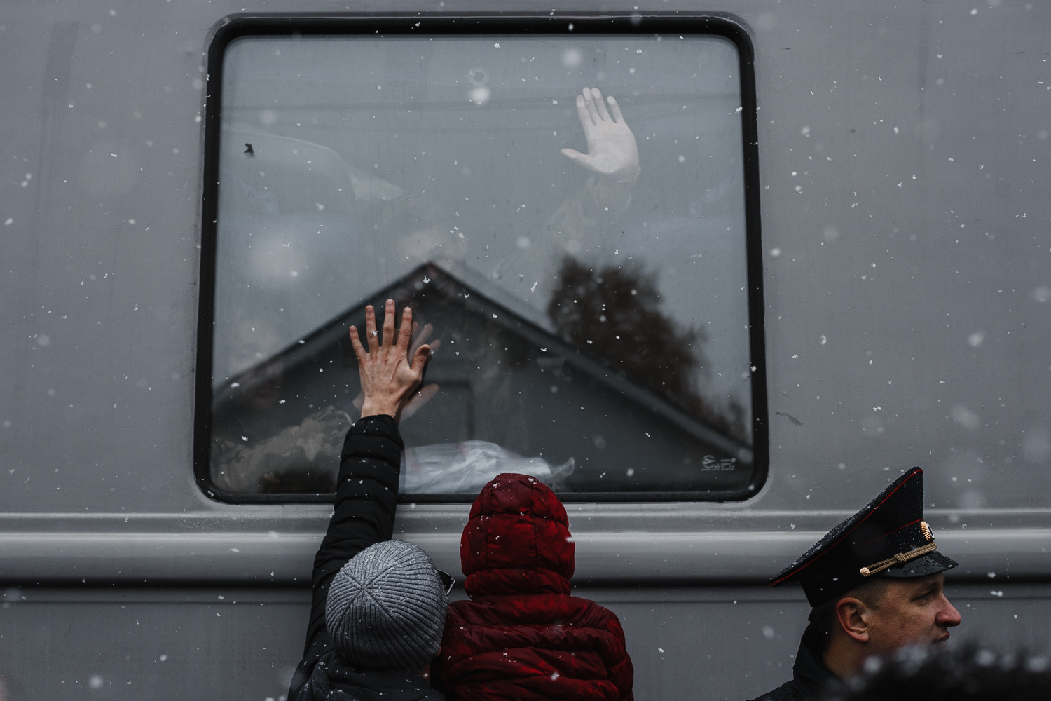 Жены бегут к автобусам, тянут к окнам руки. Мужья с той стороны рисуют на стекле сердечки.