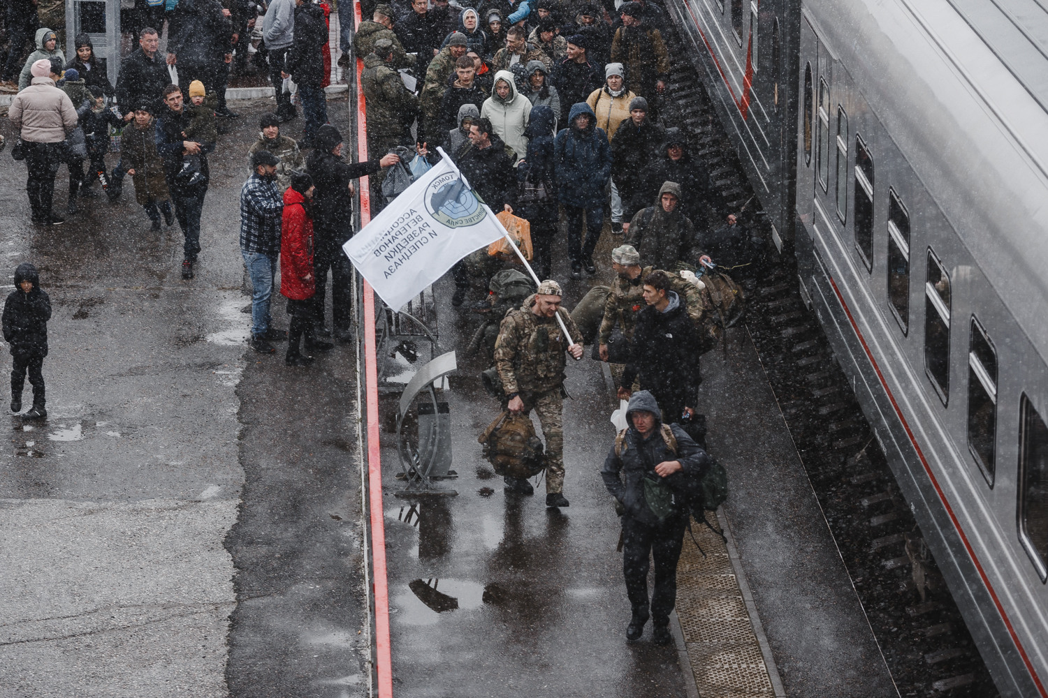 Отправка мобилизованных проходит по отработанной схеме: сначала из разных районов их привозят на автобусах, выстраивают на перроне перед зданием вокзала. Затем каждый раз одну и ту же речь произносит губернатор Томской области Владимир Мазур: мол, томичи молодцы, многие пришли заранее, не дожидаясь повесток.