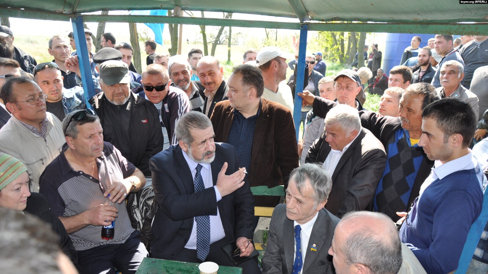 Рефат Чубаров (в костюме с галстуком по центру, держит сигарету), Мустафа Джемилев (справа от него со значком на лацкане пиджака) и другие крымские татары на Турецком валу под Армянском 3 мая 2014 года при попытке мирно попасть на полуостров. Фото Крым.Реалии