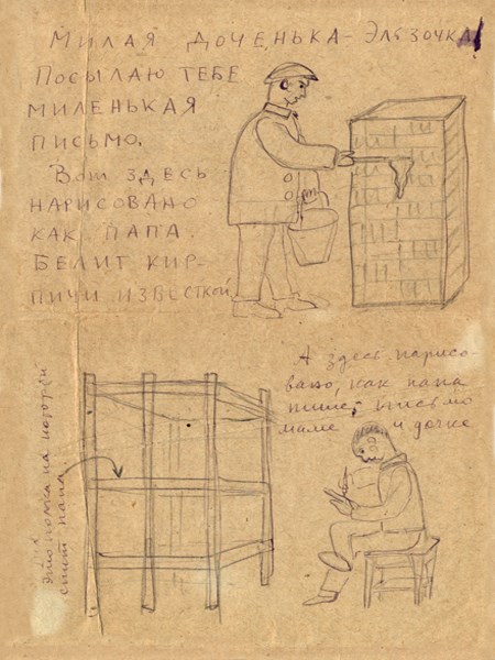 Милая доченька! Как ты поживаешь? Ходишь ли в детский садик? Твой папа сейчас в армии. Но он не стреляет в фашистов из винтовки или пулемета, а делает кирпичи для заводов, на которых будут делать танки, самолеты, пушки и бомбы. Слушайся, милая доченька, маму. Ей сейчас без папы очень трудно. Помогай маме. Одевайся сама, кушай без капризов. Ходи в детский садик. Напиши папе письмо. Нарисуй цветными карандашами: человечка, танк, самолет.