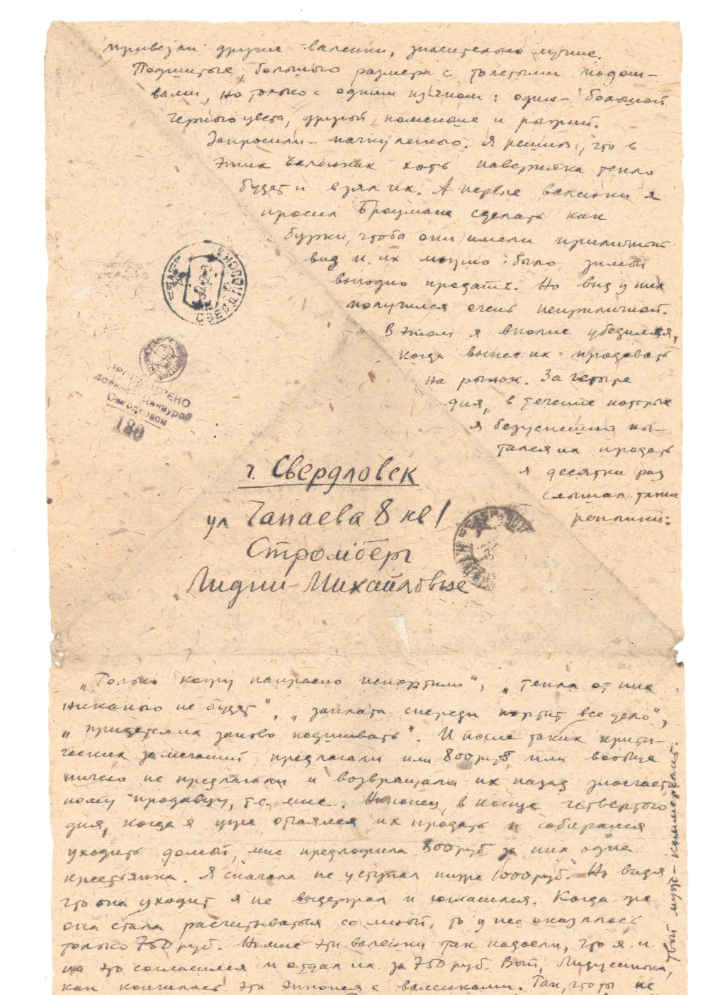 Лидуся, надо по-видимому смотреть на вещи так, как на них смотрит один заключенный, который как-то ночью возил кирпич на автомашинах. А пока кирпич грузили в автомашины мы сидели в проходной будке, и он рассказывал о своей жизни. Он находится в заключении уже года полтора и говорит, что сохранил себе жизнь и здоровье только благодаря тому, что прилагал все усилия к тому, чтобы не попасть в разряд больных и слабосильных, потому что оттуда выбраться в разряд здоровых и сильных очень редко кому удается. Когда он чувствовал, что начинает слабеть, то все продавал с себя, чтобы прикупить лишний кусок хлеба, так как считал, что если он доживет до окончания срока заключения, то выйдя на волю он быстро сможет нажить и приобрести все потерянное. Так что, Лидуся, мы так с тобой и договоримся, что если начну слабеть или заболею, то напишу тебе. Ты продай мой костюм, еще что-либо или сменяй прямо на продукты – хлеб, жиры. Пока же все в порядке и у меня даже имеются 700 г "аварийного" хлеба. Так что получая новые 700 г, я их откладываю, а питаюсь предыдущими 700 г. Изредка добавляю сухари, когда пью чай. Сахар и лук у меня еще есть. Теперь есть еще масло, так что май месяц проживу припеваючи.