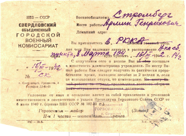 В феврале 1942 года 32-летнего доцента Уральского политехнического института Армина Стромберга пригласили в Свердловское областное управление НКВД, где ему была вручена повестка о призыве в Красную армию. Блестящий ученый, кандидат химических наук Стромберг работал в тот период в лаборатории, которая занималась исследованиями для нужд военной промышленности, внедрял на оборонных заводах Урала новые приборы – полярографы, необходимые для анализа сплавов, и имел "бронь" от армейской службы. Но сотрудник НКВД объяснил ученому, что "служить" он будет далеко от линии фронта, в одном из лагерей Нижнего Тагила.