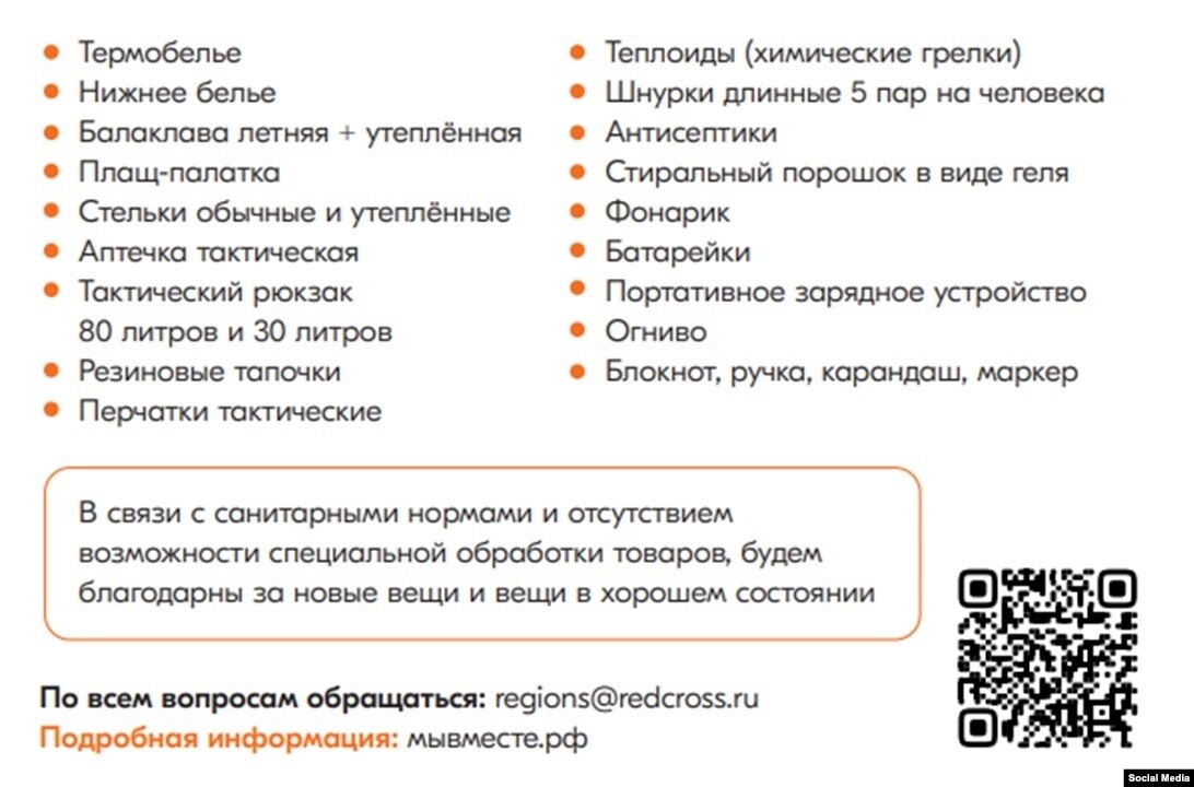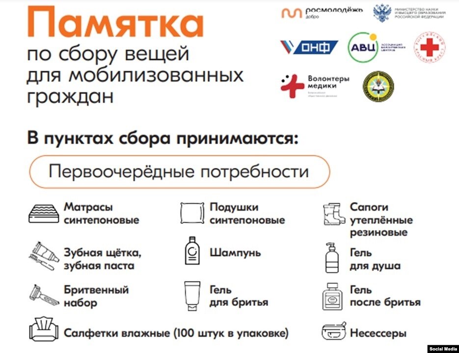 Такие перечни открыто выкладывают органы власти, а прогосударственные волонтерские проекты призывают принять участие в сборе "гуманитарной помощи для мобилизованных граждан".