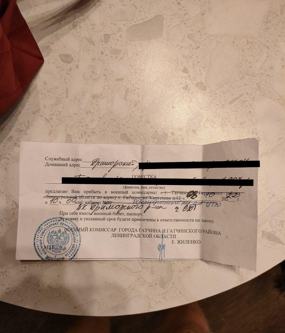 У многих вызывало вопросы само оформление повесток, которые им вручали в Гатчине. В них, как рассказал Антон Викторов, тоже отбывавший административный арест после митинга, содержалась фраза о том, что задержанным "предлагается прибыть в военный комиссариат". Адрес военкомата исправлен.