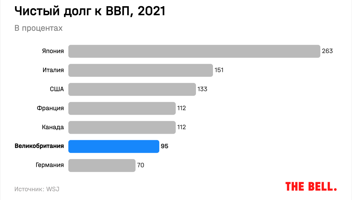События в Великобритании могут оказаться только трейлером к тому, что может произойти в других странах в условиях высокой инфляции и растущих ставок, пишет колумнист Wall Street Journal Джеймс Маккинтош. Увеличение заимствований для стимулирования экономики может столкнуть фискальную и монетарную политики. Как показали эти недели, чем больше надо будет занимать, тем больше будет падать национальная валюта и тем выше будут расти ставки. При этом надо учитывать, что уровень госдолга в Великобритании — далеко не самый высокий среди развитых стран.