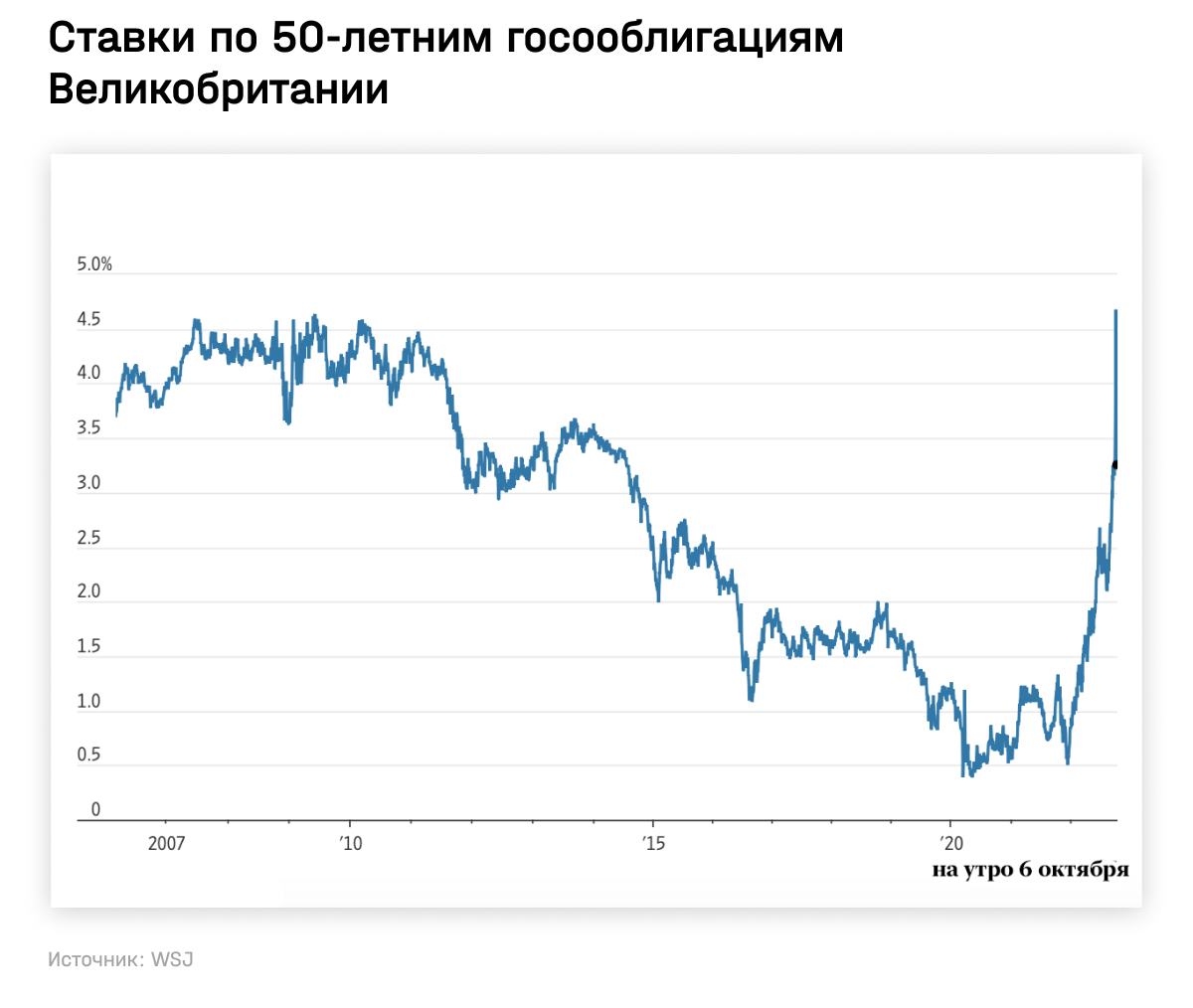 - Возникла серьезная угроза для финансовой стабильности в Великобритании: стоимость 50-летних облигаций за четыре дня упала на треть. Для сравнения, это в два раза больше предыдущего рекордного падения за такой же период. Британские пенсионные фонды, которые со времен падения пузыря доткомов держат большую часть портфеля в облигациях, были вынуждены начать продавать активы, чтобы покрыть обязательства по деривативам, которые использовались для хеджирования рисков движения ставок. Подробно эта схема, ставшая более рискованной из-за роста ставок, описана здесь. Ситуация напоминала крушение Lehman Brothers в 2008 году — несколько сложных финансовых продуктов начали сыпаться практически одновременно, отмечал старший редактор Bloomberg Джон Отерс.