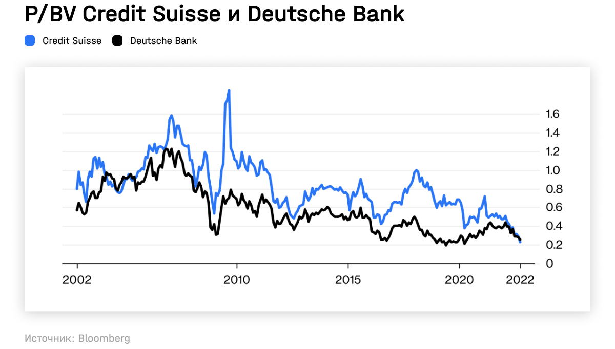 C другой стороны, CS, как и другой крупный фининститут, Deutsche Bank, торгуется меньше чем за 25% от своей балансовой стоимости (активы минус обязательства), что отражает неуверенность в качестве активов. Для CS (в отличие от Deutsche) это рекордно низкий уровень. Но Deutsche стоит почти так же дешево по P/BV, как и CS, в основном по макропричинам — из-за усилившейся неопределенности в экономике Германии после взрывов на двух российских газопроводах, отмечает Чиркова.