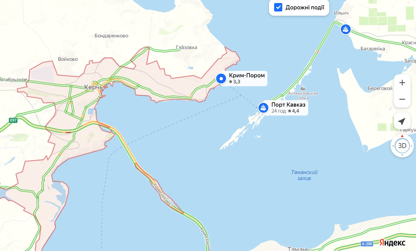 На данный момент пробок на дорогах в этом районе Керчи российский ресурс «Яндекс-пробки» не фиксирует. В настоящее время грузовой транспорт скопился в специальных отстойниках в Керчи, где ожидает погрузки на паромы. Российская администрация Керчи публично сообщила, что на этих площадках находятся более 650 грузовиков и обратилась к керчанам с просьбой помочь водителям фур продуктами.