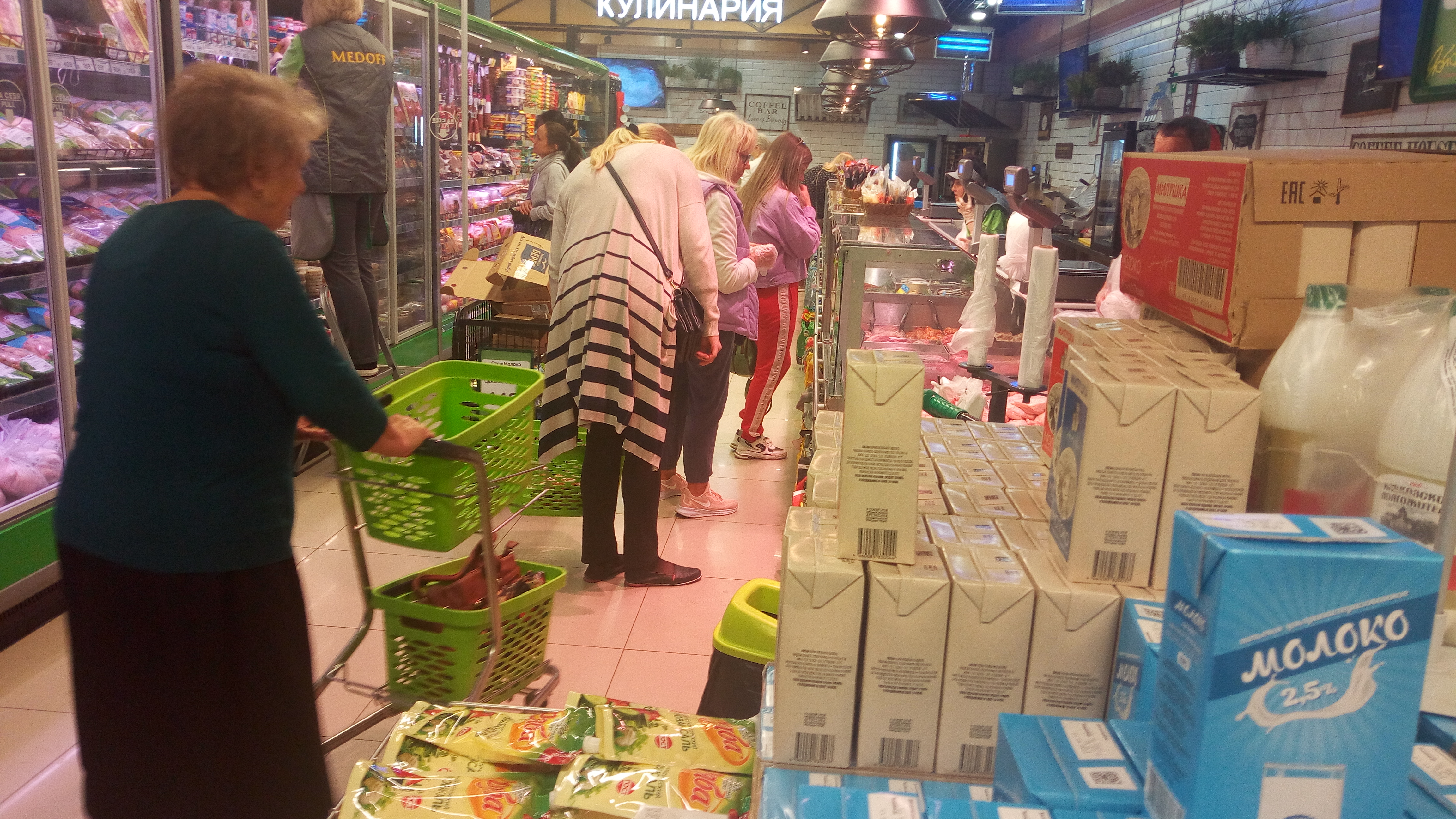 Корреспондент Крым.Реалии 12 октября побывал в продуктовых магазинах Ялты. Визуальных признаков ажиотажа или дефицита продуктов на полках, по его словам, нет.