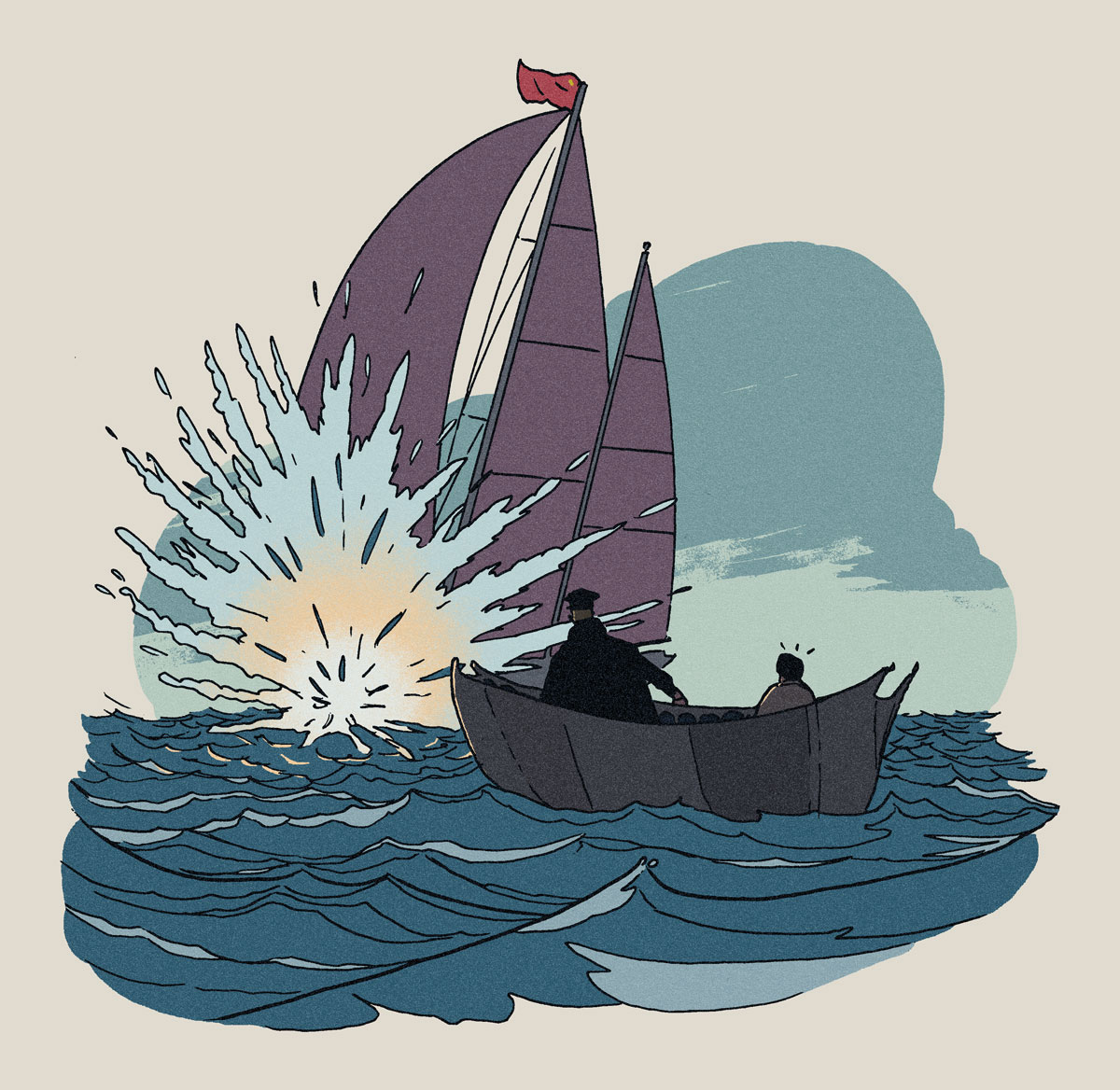 Около 11 утра недалеко от лодки внезапно появился советский парусник — кеч. Он следовал за ними и быстро приближался. Корабль был недостаточно близко, чтобы можно было увидеть людей на палубе. Но Олег решил, что его и отца могут обстрелять. Валерий же понял, что спасти их может только обман. Он выключил двигатель и поднял руки, как будто бы сдаваясь. Когда кеч приблизился, Валерий взялся за веревку, к которой привязал водонепроницаемую динамитную шашку. Он поджег фитиль, бросил динамит в воду и потянул его за веревку так, чтобы он оказался где-то между Минаковыми и их возможными преследователями.