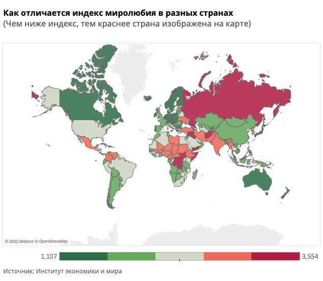 Институт экономики и мира опубликовал глобальный ежегодный индекс миролюбия. Он измеряет уровень насилия внутри стран и агрессивность внешней политики государств.