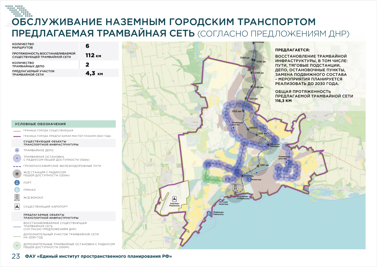 До ***** население Мариуполя было около 450 тысяч человек. До сих пор точно неизвестно, сколько жителей покинуло город или погибло во время боевых действий. Однако в мастер-плане мы нашли проектное население Мариуполя на 2022 год — это 212 тысяч человек. На 2025-й — 350 тысяч; через восемь лет, в 2030-м, численность населения должна сравняться с до*******; в 2035 году в Мариуполе, по мысли планировщиков, будет полмиллиона жителей.