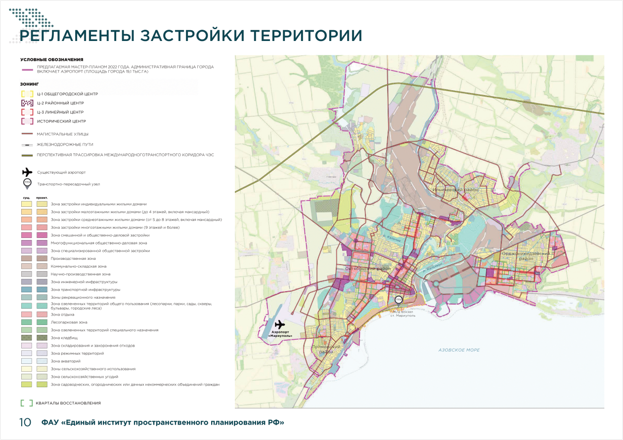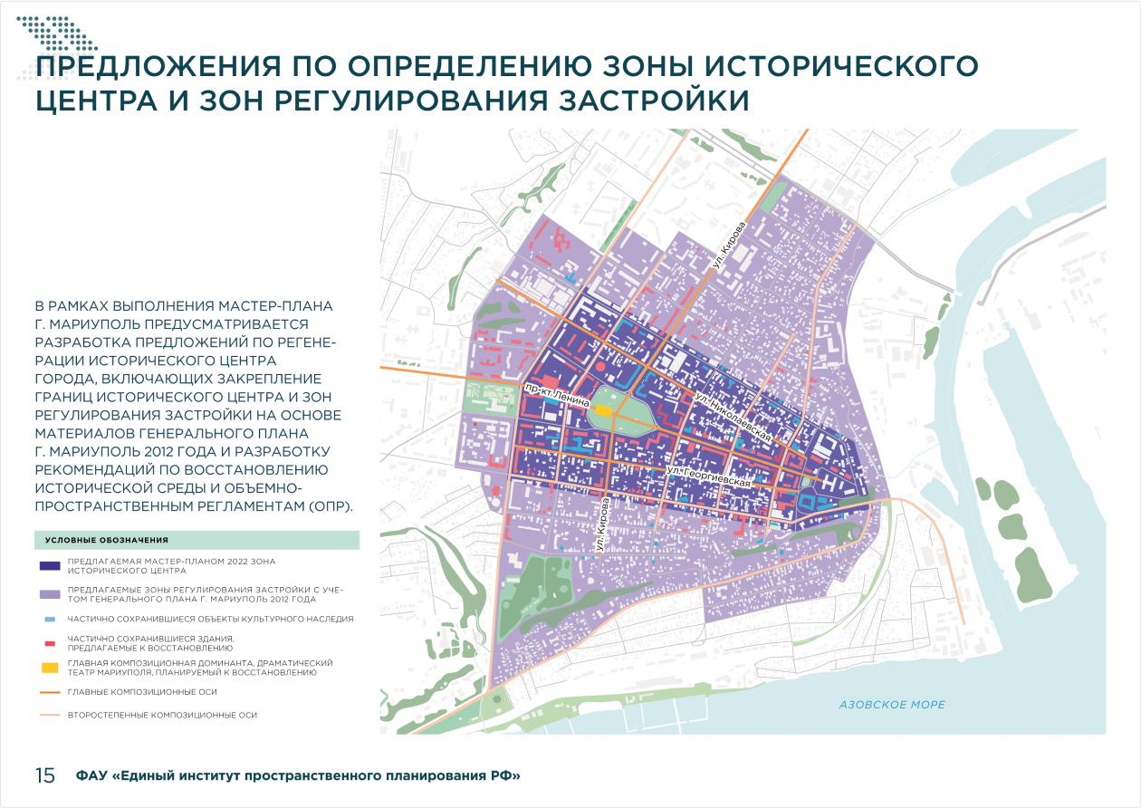 Максимальная высота мариупольской застройки будет 15 этажей; в центре — десять. Среди зданий, которые планируют восстановить, — драматический театр (в документе он обозначен как «Русский драматический театр»), в бомбоубежище которого 16 марта 2022 года погибли сотни людей. При зонировании Мариуполя будут опираться на городской генплан 2012 года.