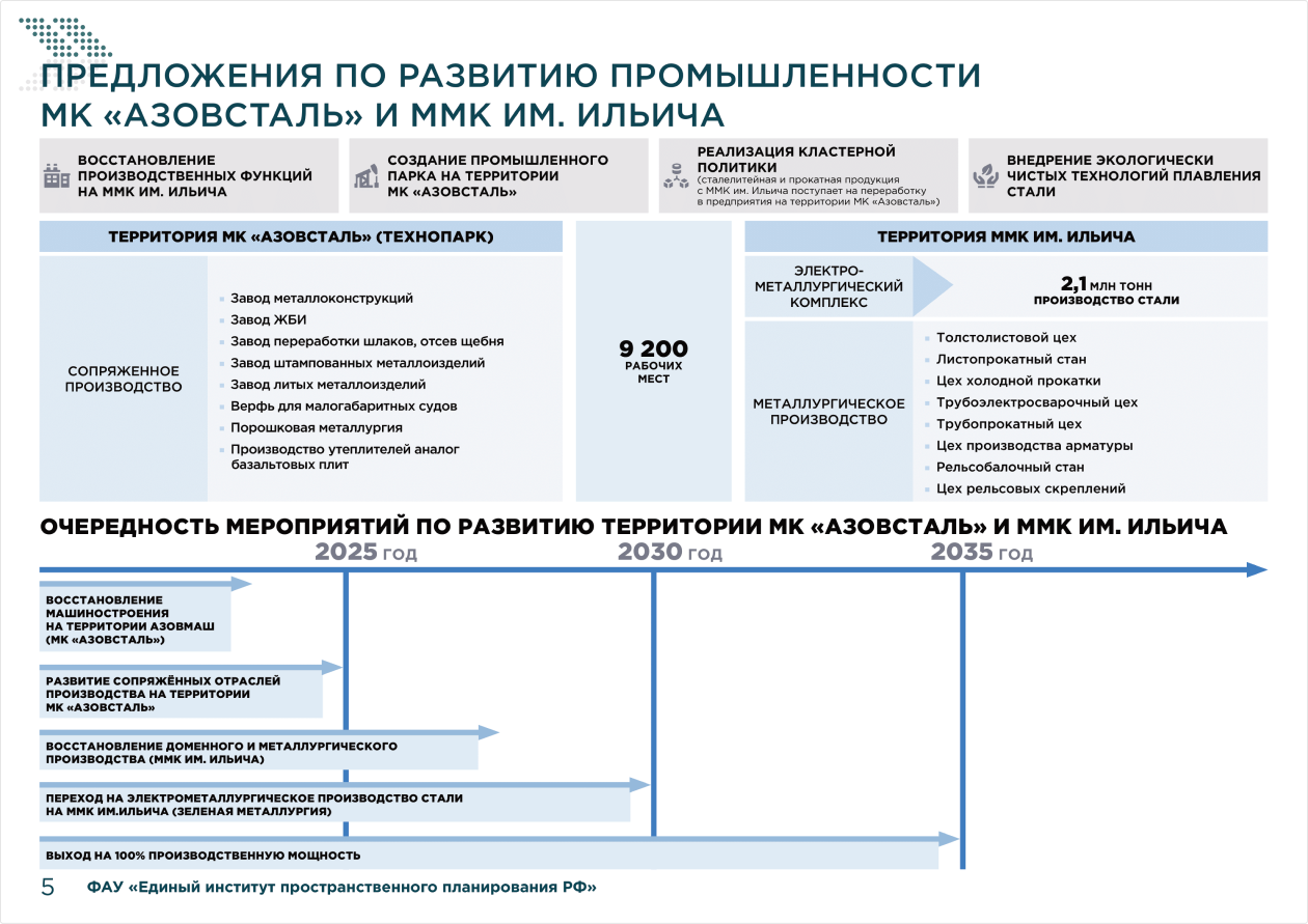 «Приоритетная отрасль городской занятости», как и раньше, — обрабатывающие производства (23 %) и металлургия. В городе планируют развивать и «Азовсталь» — разрушенный комбинат, в котором больше месяца держали оборону осажденные украинские военные, — и комбинат имени Ильича. Оба предприятия принадлежат богатейшему бизнесмену Украины Ринату Ахметову.