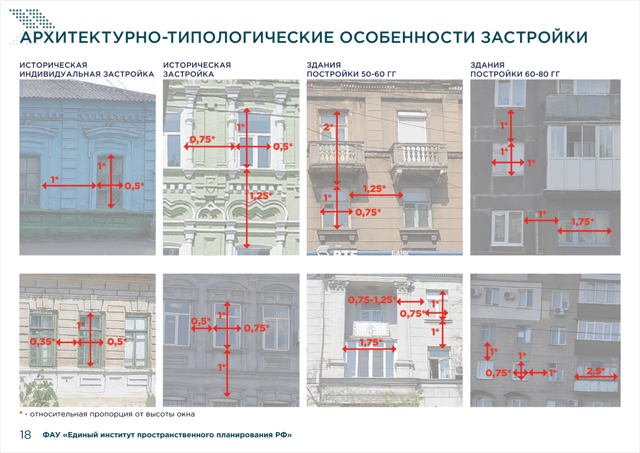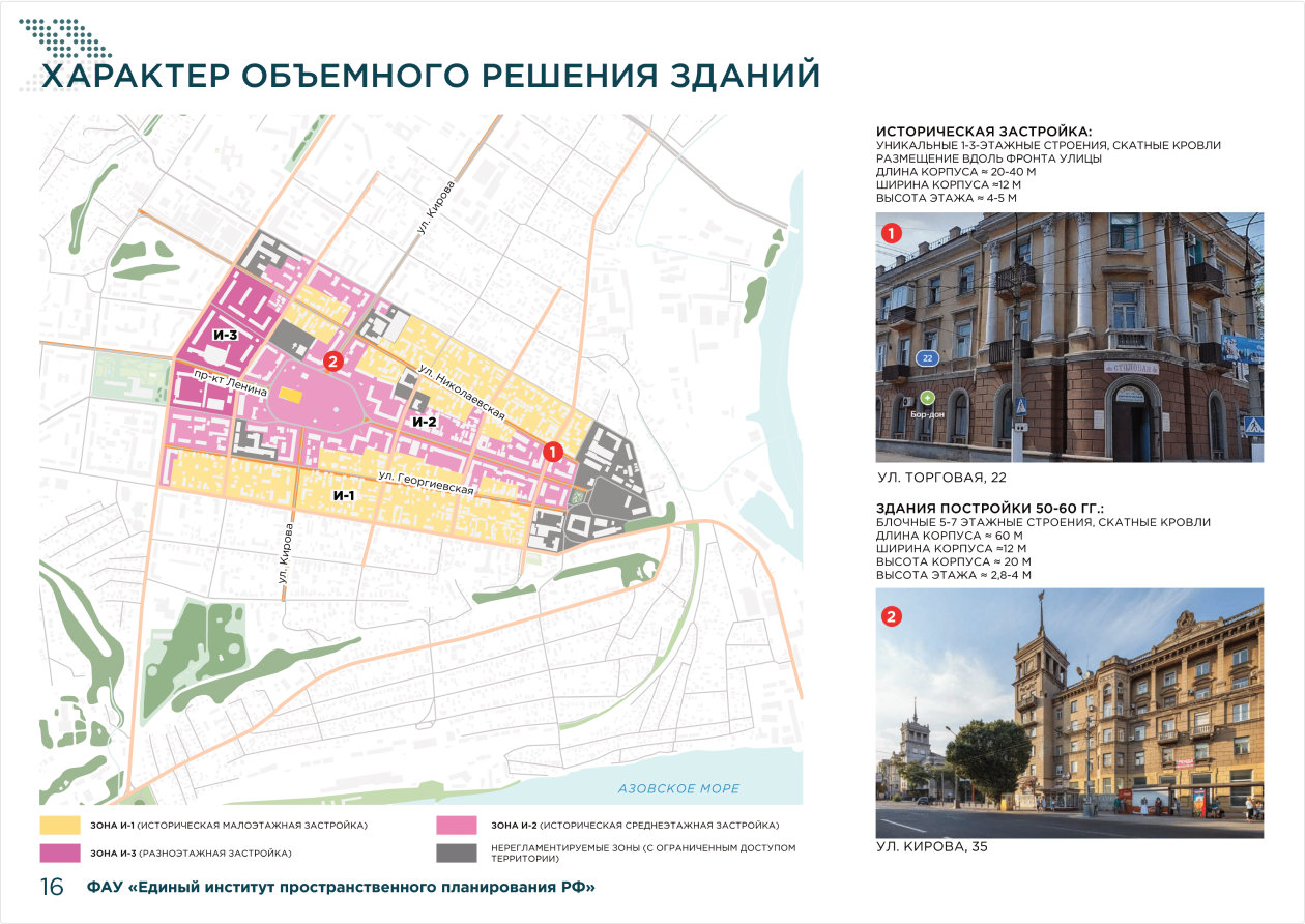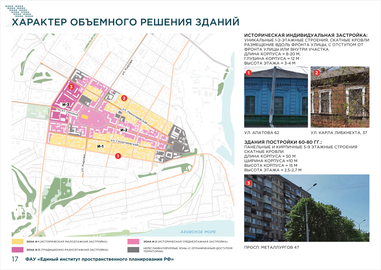 В мастер-плане перечислено четыре типа застройки Мариуполя: исторические многоквартирные и индивидуальные дома, послевоенные и позднесоветские здания. Примеры застройки в документе проиллюстрировали фотографиями домов, сделанными до 24 февраля 2022 года — об этом The Village сообщили несколько горожан, до сих пор остающихся в Мариуполе. Все здания пострадали во время боевых действий весной.