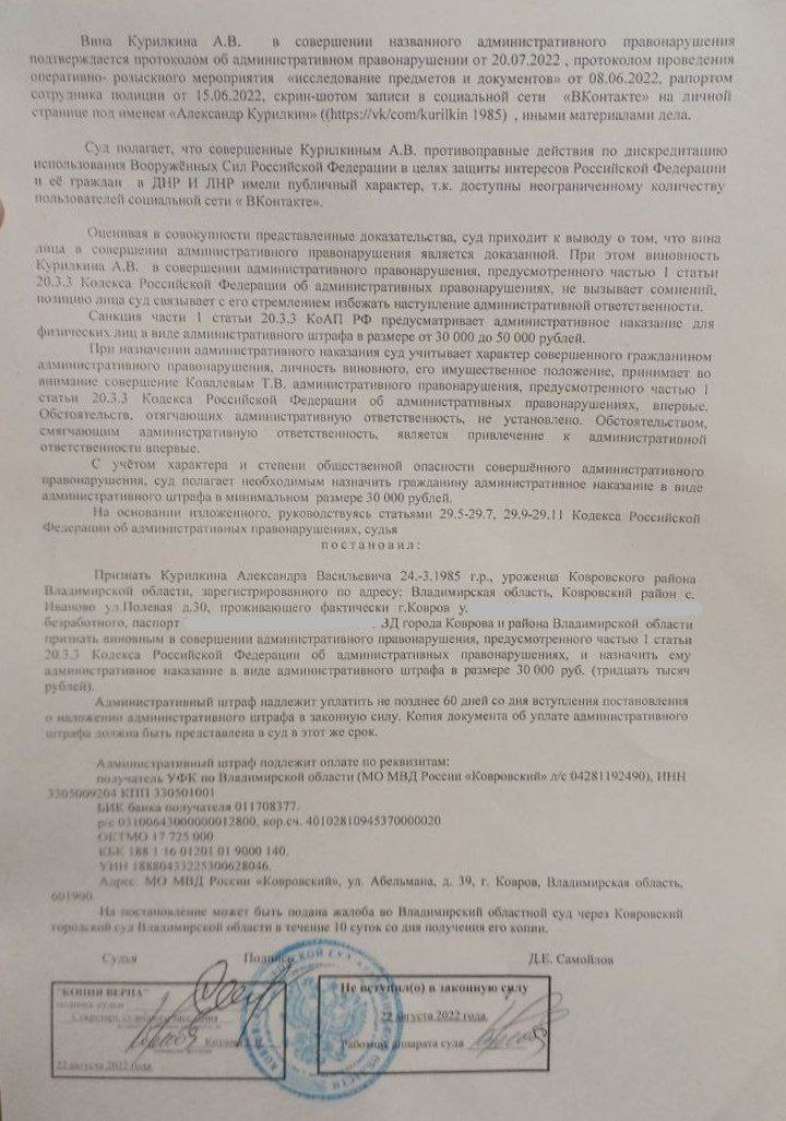 Владимирский областной суд отклонил апелляционную жалобу жителя Коврова Александра Курилкина. Активист оспаривал решение Ковровского городского суда, который на тридцать тысяч рублей оштрафовал его из-за антивоенных публикаций во «ВКонтакте». Мужчине вменили статью о дискредитации российских вооружённых сил (ч. 1 ст. 20.3.3 КоАП РФ). Об этом говорится в карточке дела на официальном сайте суда.