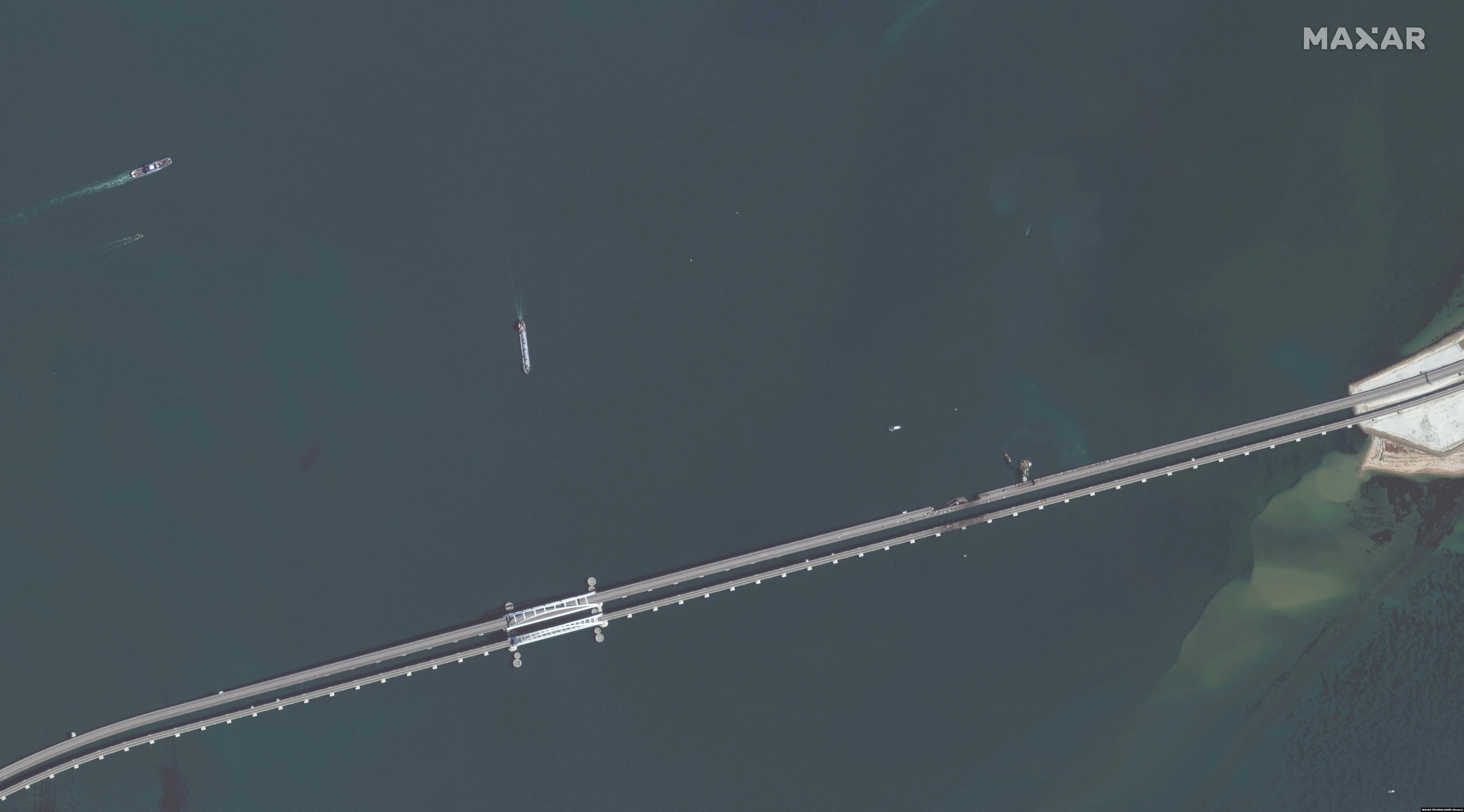 Агентство Reuters опубликовало спутниковые снимки очередей грузовиков в Керчи и ремонта Керченского (Крымского) моста, поврежденного в результате взрыва и пожара 8 октября 2022 года.