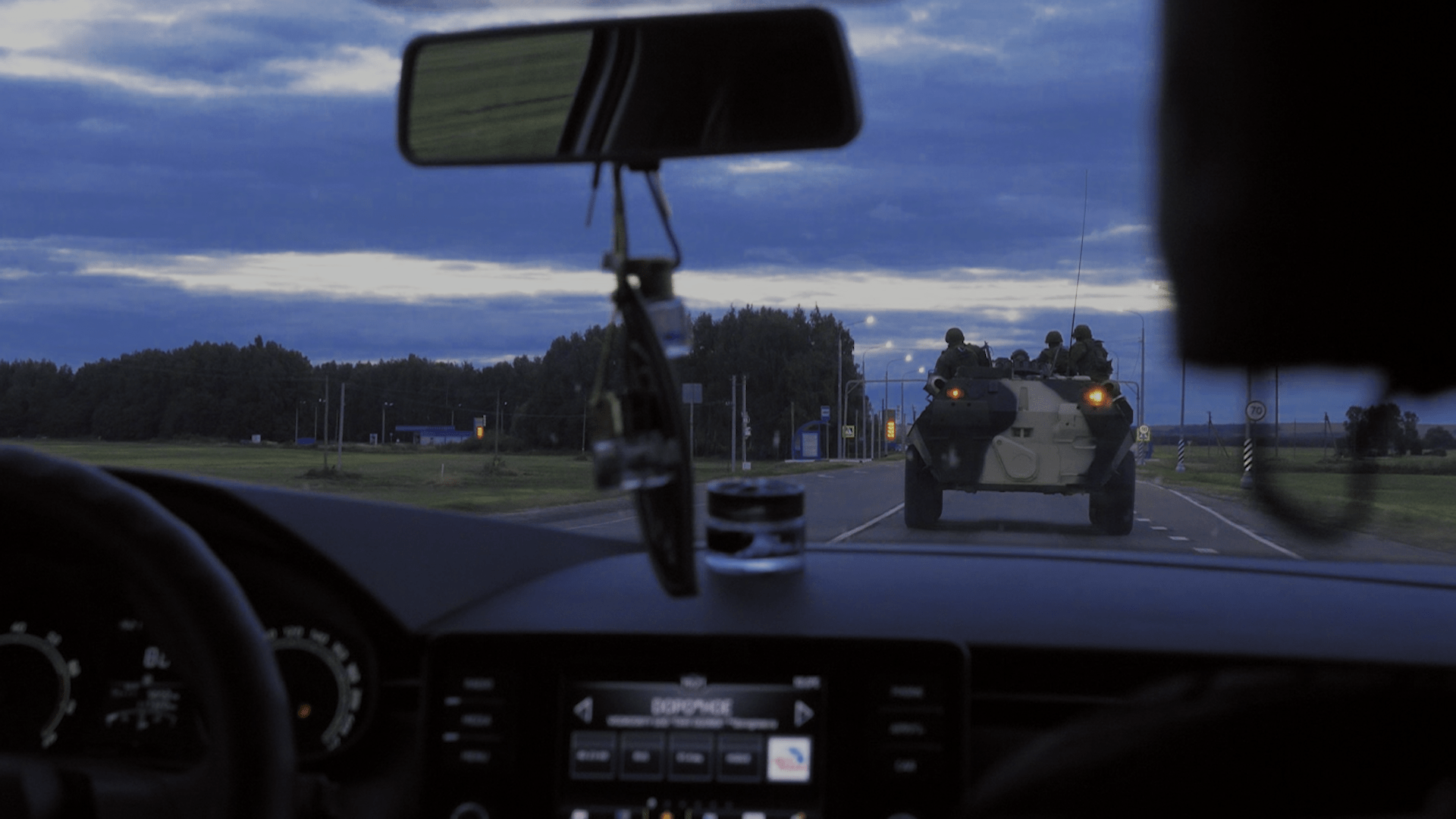 Российский бронетранспортер на дороге возле Белгорода. Скриншот из документального фильма «Пограничная зона»