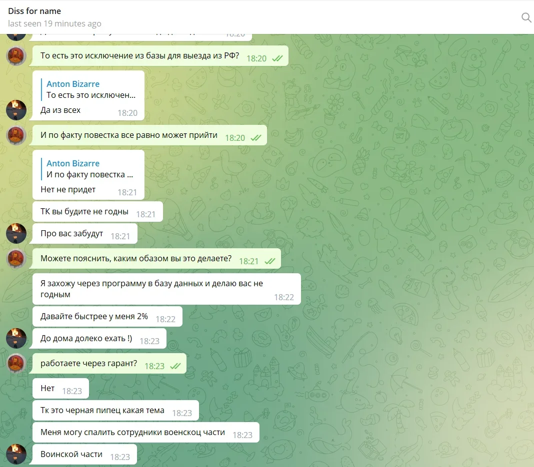 One more person we spoke to offered us to forge health category D (temporarily unfit for military service) in some police database, as well as the non-existent “military database.”
