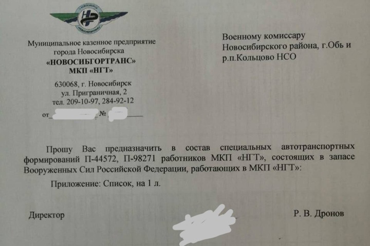 13:19 В распоряжении Тайги. инфо оказалась копия письма начальства другого муниципального транспортного предприятия «Новосибгортранс» (НГТ), адресованного военному комиссару Новосибирского района области. Директор учреждения Роман Дронов лично просит «предназначить в состав специальных транспортных формирований работников МКП „НГТ“, состоящих в запасе».
