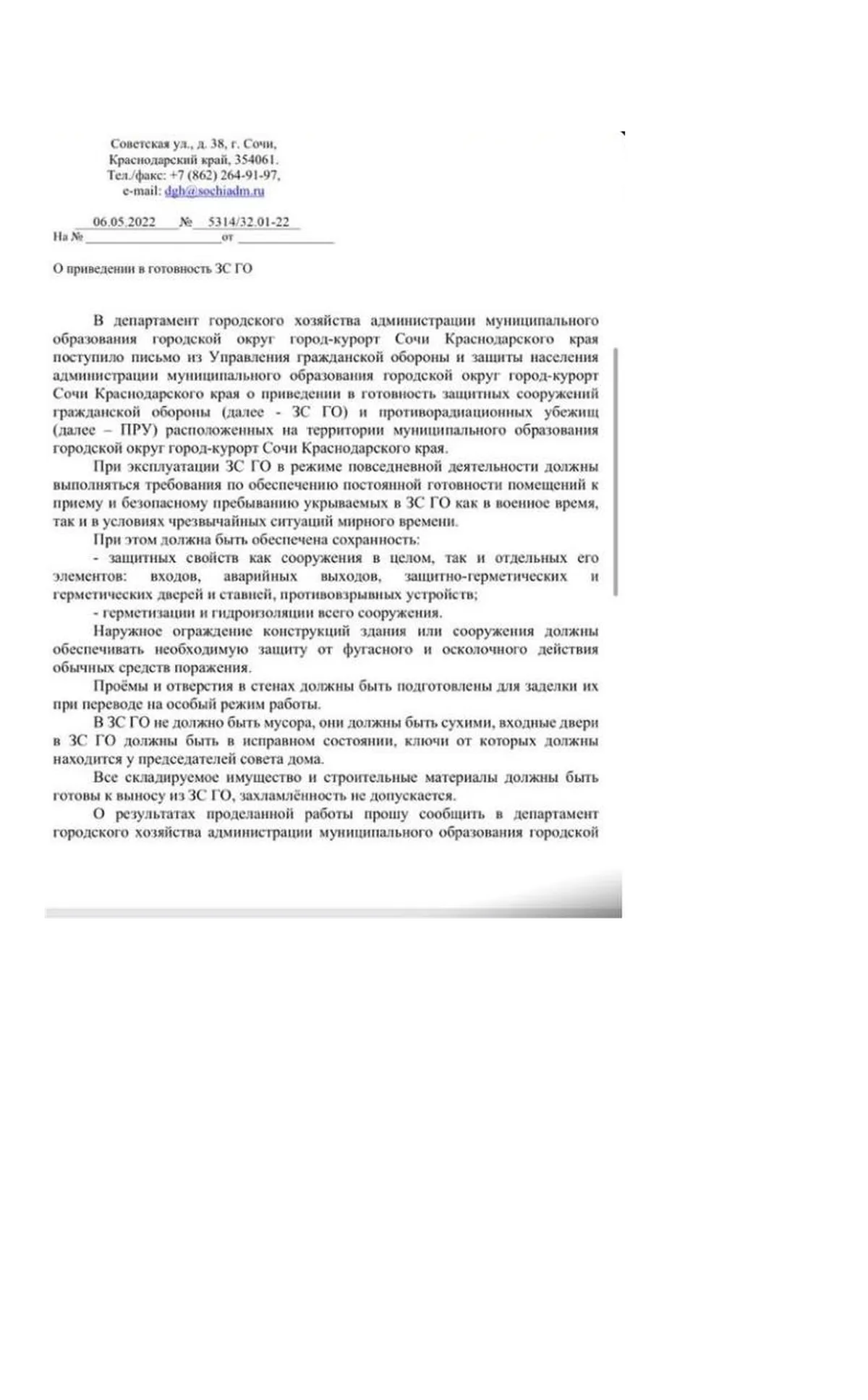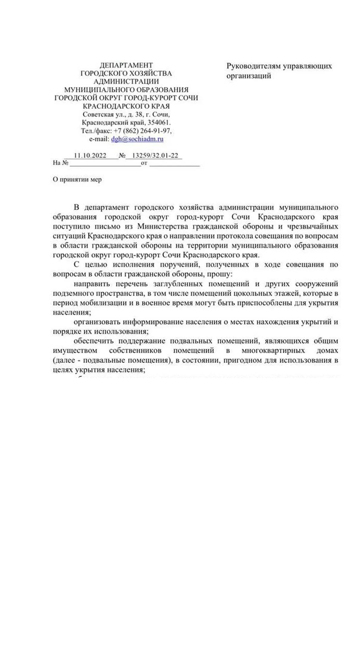 В распоряжении «Важных историй» есть, например, два письма департамента городского хозяйства Сочи руководству управляющих компаний. Они датированы 6 мая и 11 октября, в обоих чиновники просят компании подготовить укрытия.