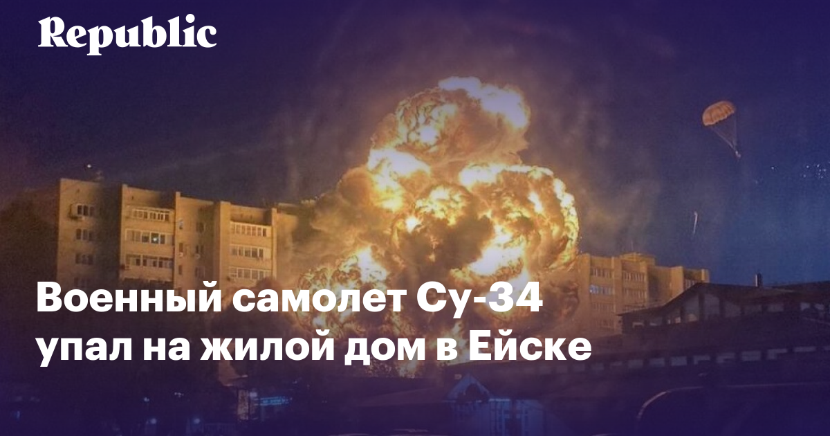 В Ейске (Краснодарский край) на жилой дом упал военный самолет Су-34. После падения самолет взорвался, дом загорелся, а пилоты успели катапультироваться — на фото выше видно человека с парашютом.