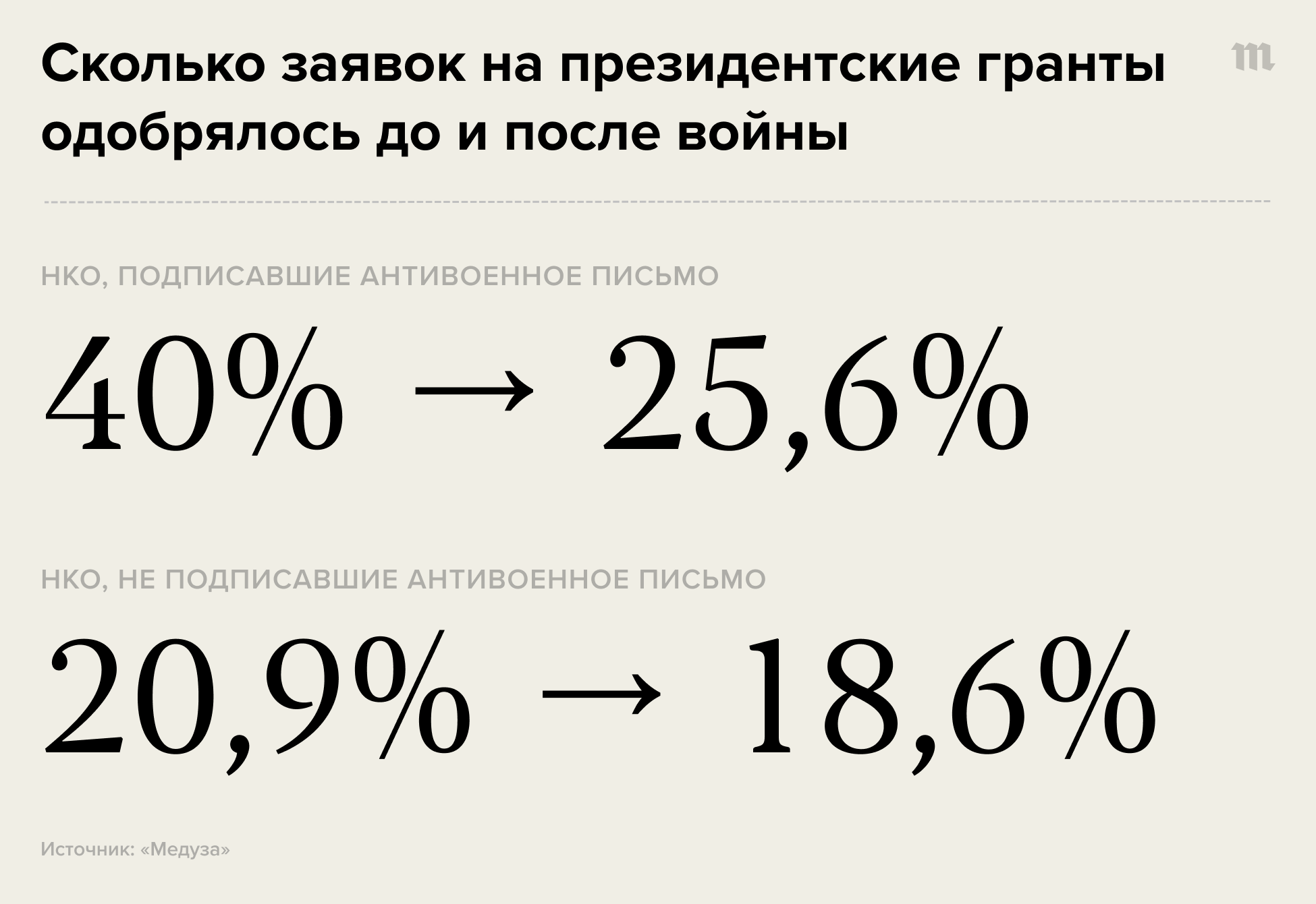 От НКО-подписантов до войны было 930 заявок, победили 372 (40%). После начала войны — 219 заявок. Победили 56 (25,6%). И вот это падение выглядит очень заметным. Эти заявки в массе своей мало касались политики и не касались войны — они касались помощи детскому досуговому центру в ауле в Карачаево-Черкесии, помощи родителям, у чьих детей обнаружили нарушения слуха, психологической помощи женщинам с онкологическими заболеваниями и помощи многим другим людям.
