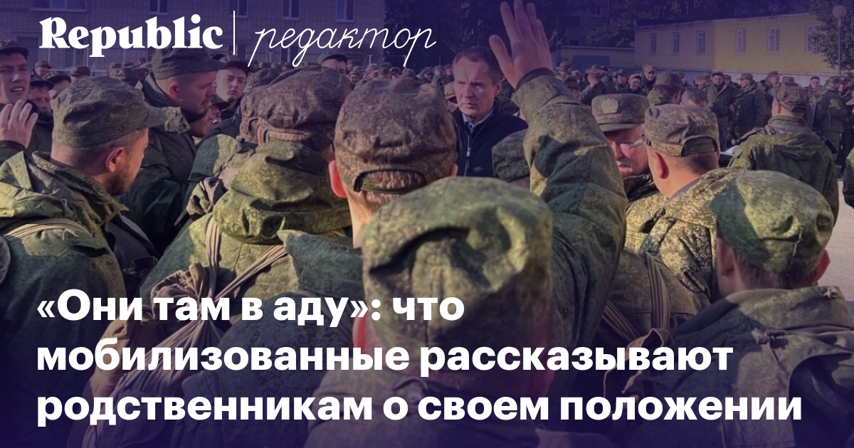 С Republic связались семьи мобилизованных из Белгородской области, которых без подготовки отправили воевать с Украиной на передовую. По их словам, группу из 70 белгородцев призвали 23 сентября, и всего через несколько дней они оказались под Луганском. Мобилизованные жалуются родным, что оказались под постоянными обстрелами без обмундирования, воды, пищи и даже командиров. Жены, сестры и матери мобилизованных рассказали Republic, как в их дома пришла мобилизация, чего они от нее ожидали и как столкнулись вовсе не с той реальностью, которую им рисовала картинка по телевидению.