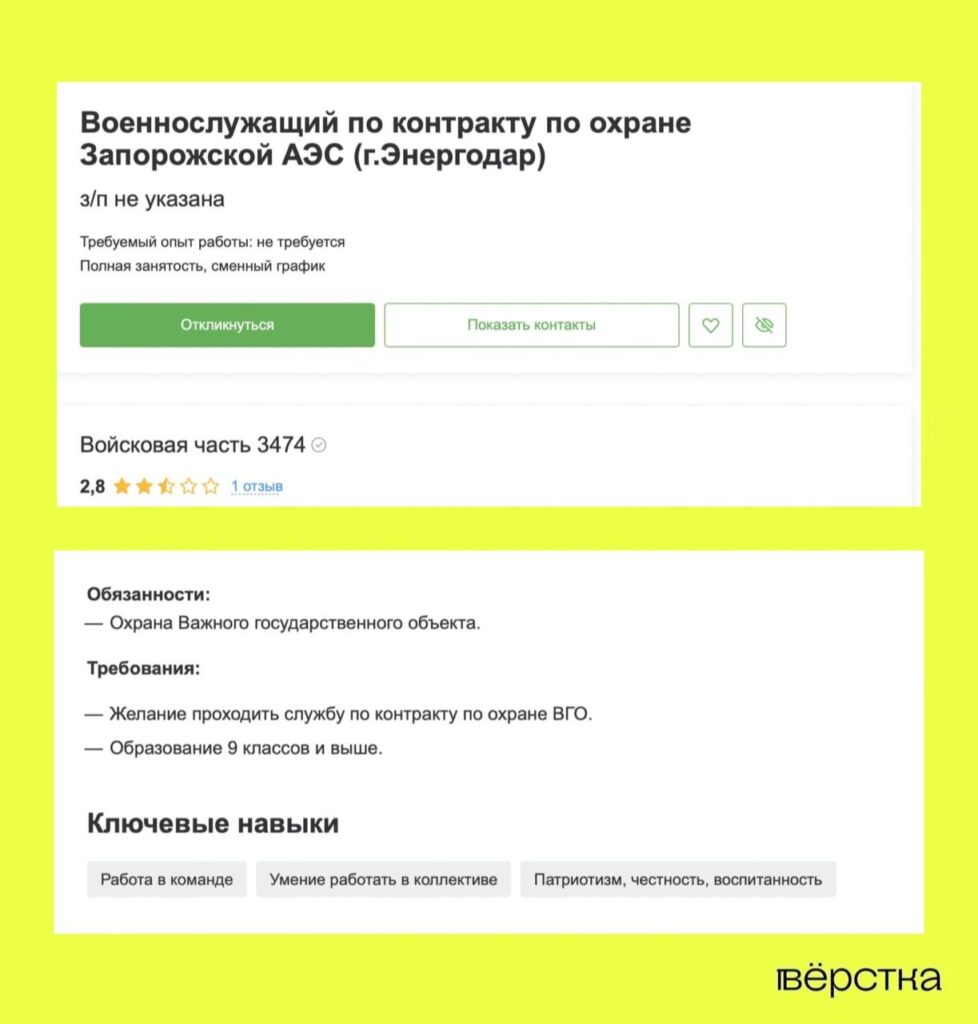 Войсковая часть 3474 опубликовала на портале Headhunter 50 вакансий военнослужащих для охраны Запорожской атомной станции на оккупированных территориях Украины.