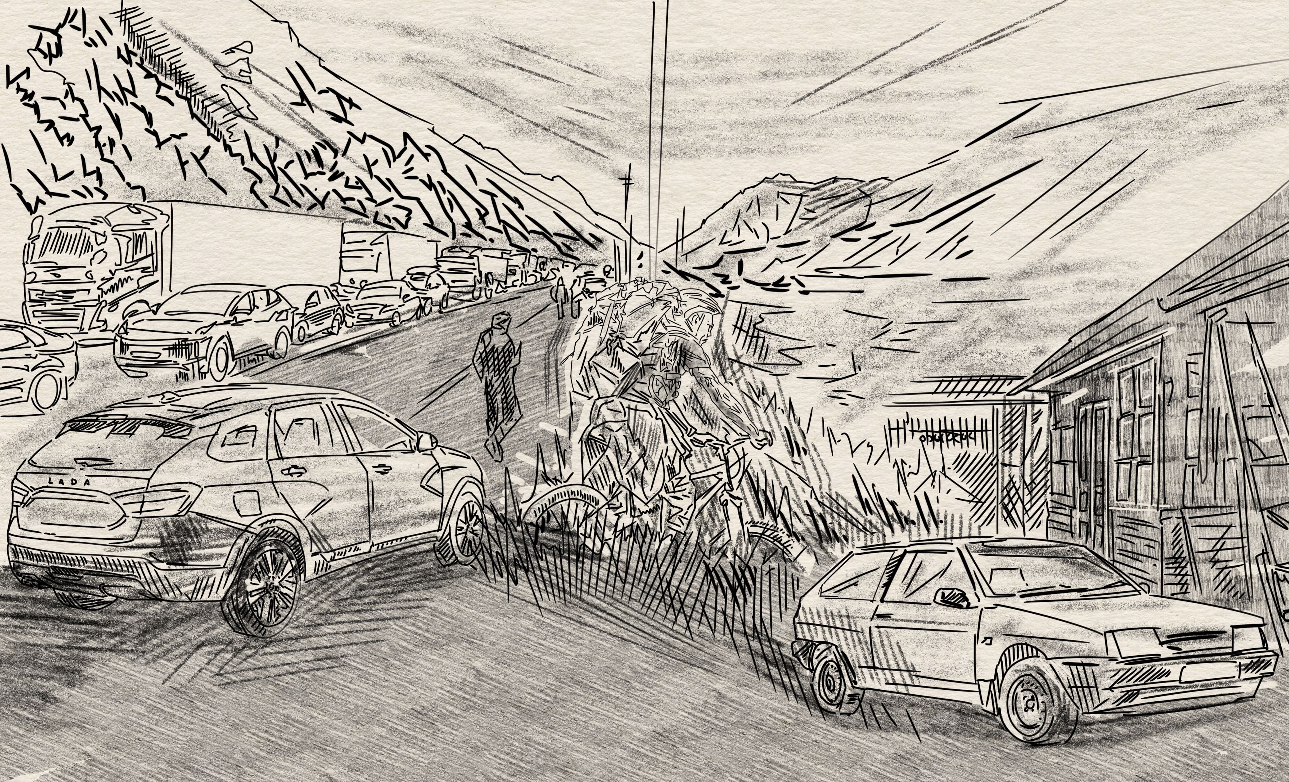 Весной, когда Алексей с Олесей преодолевали тот же погранпункт и два дня ждали в очереди схода лавины, было холодно и тяжело. Казалось, летом будет проще. Но один ряд машин на этот раз сменился шестью. «Ощущение движения было только от карусели курсирующих осетин, круговорота их машин около КПП, — вспоминает Олеся. — Пробка от этого стояла, двигалась только эта денежная юла».