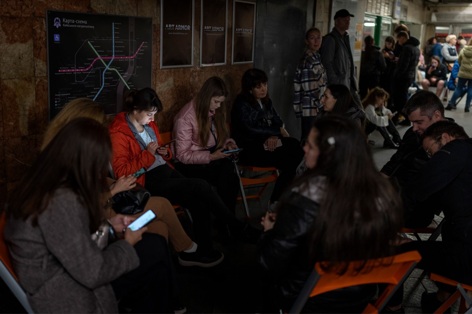 На фото: жители Киева пережидают воздушную тревогу в метро 19 октября.