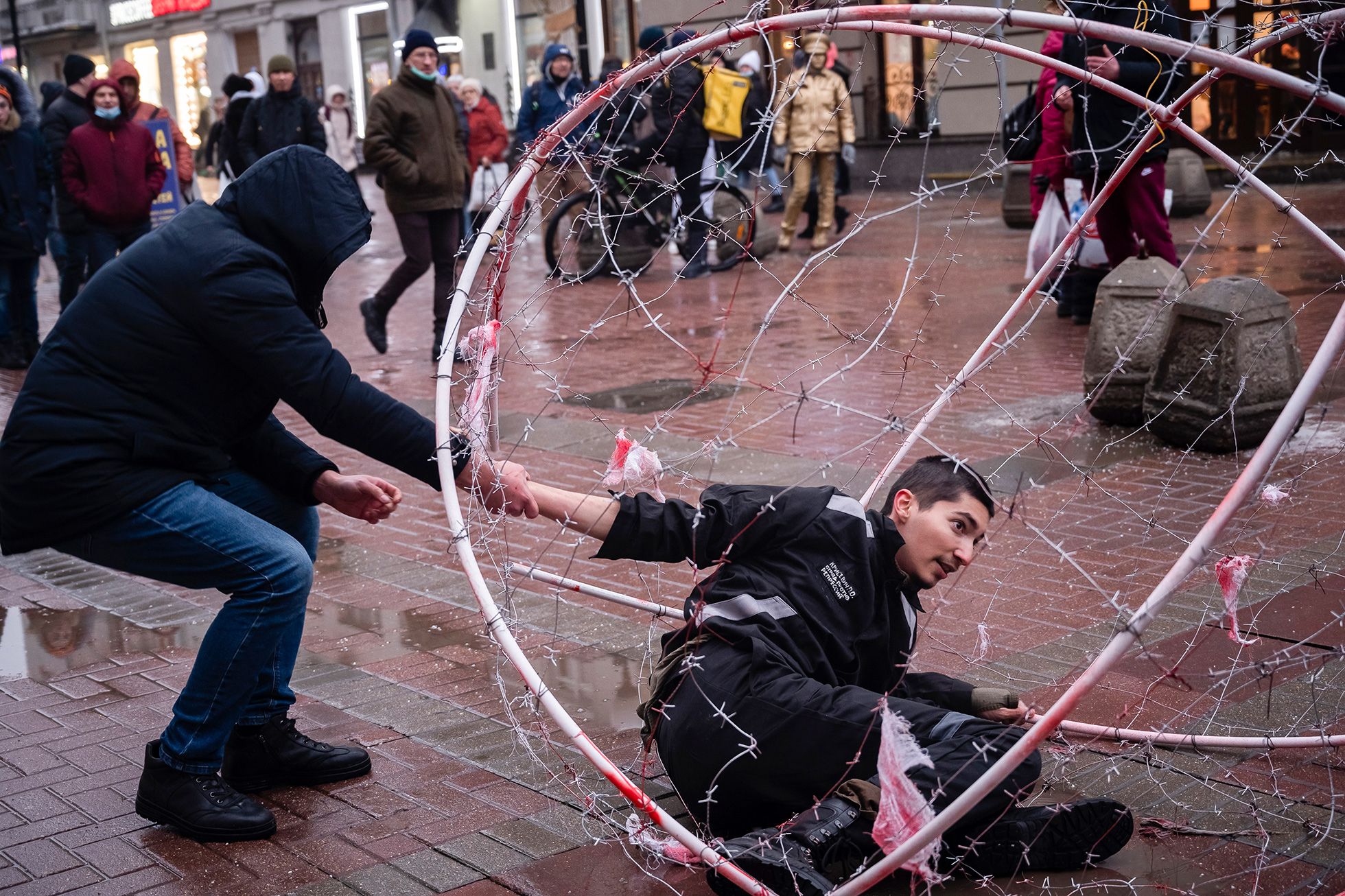 Акция с колючей проволокой проходила на Старом Арбате, самой туристической столичной улице — идеальное место, чтобы исследовать мир российского обывателя, который Крисевич считает тюрьмой — и который он снова и снова стремится покинуть через символическое самоубийство. За эту работу художник получил две недели ареста.