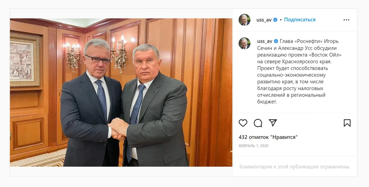 А Красноярский край меж тем — кладовая родины и ее кормилец, ее закрома и житница: золото и платина, нефть и газ, космические спутники и оружие возмездия. Вмещает в себя чуть не две Западные Европы (почти пять Франций или 11 Англий) да еще Дерипаску (Семью) с Потаниным («Норникель»). Ну или вот виньетка: не так давно многочисленные СМИ сообщали, что Усс-младший якобы получил руководящую должность в «Восток Ойл» — «дочке» «Роснефти», что будет осваивать крупнейшее месторождение, самый масштабный инвестпроект нового освоения Арктики. Это на севере Красноярского края. Позже и Усса-старшего назначили в совет директоров «Роснефти».