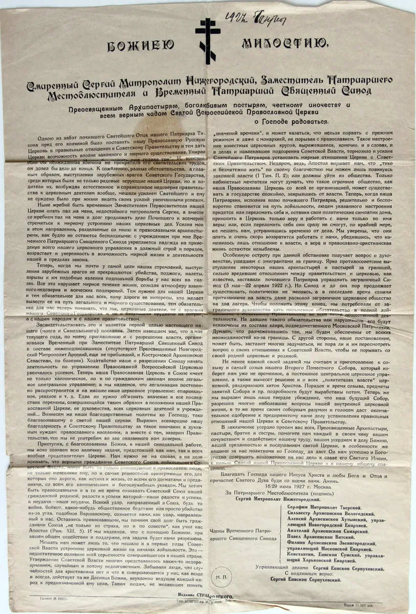 Листовка с текстом декларации митрополита Сергия. Фото: Wikimedia