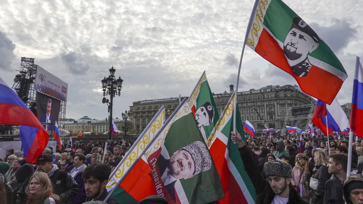 Люди держат флаги России и Чеченской Республики с портретом Рамзана Кадырова во время митинга в поддержку присоединения Донбасса к РФ. Москва, 23 сентября 2022 года. Фото: EPA-EFE / MAXIM SHIPENKOV