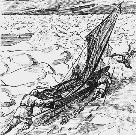 В этом, действительно, был смысл: запасов провизии уже не хватало на всех для следующей зимовки, которая казалась неминуемой, а половина команды вполне могла продержаться на корабле до следующей весны. Несколько недель ушло на то, чтобы соорудить деревянные сани, сшить палатки и сделать кустарные байдарки, на которых можно было бы преодолевать полыньи.