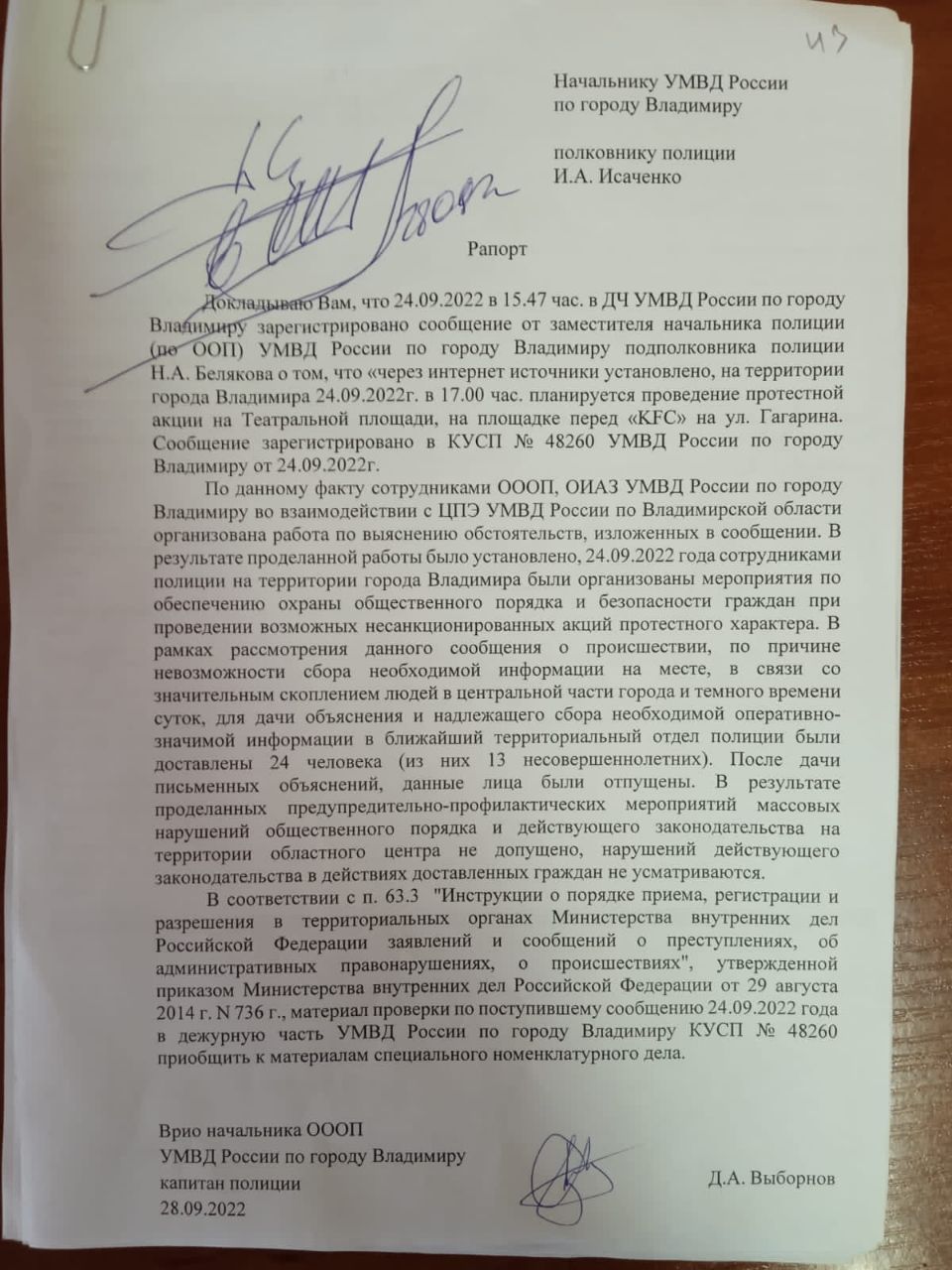 Девушку арестовали на трое суток по делу об организации митинга против мобилизации. При этом сам митинг, по словам полицейских, во Владимире даже не состоялся.