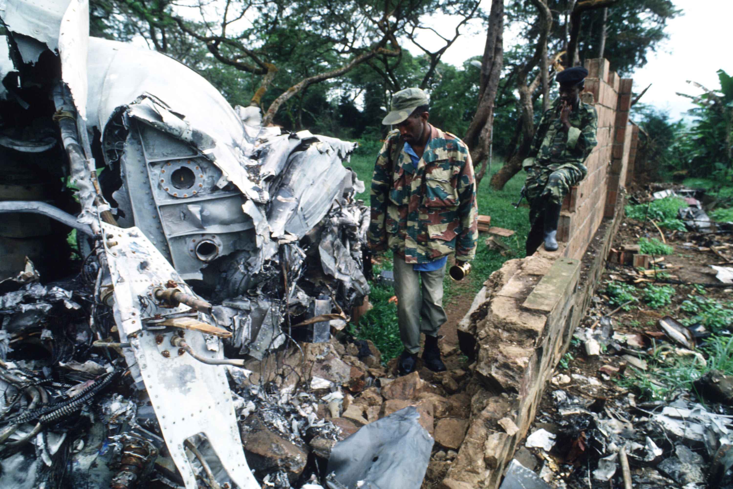 Руандийский солдат смотрит на обломки самолета, в котором летел президент страны Жувеналь Хабияримана. Getty Images / "Бабель"