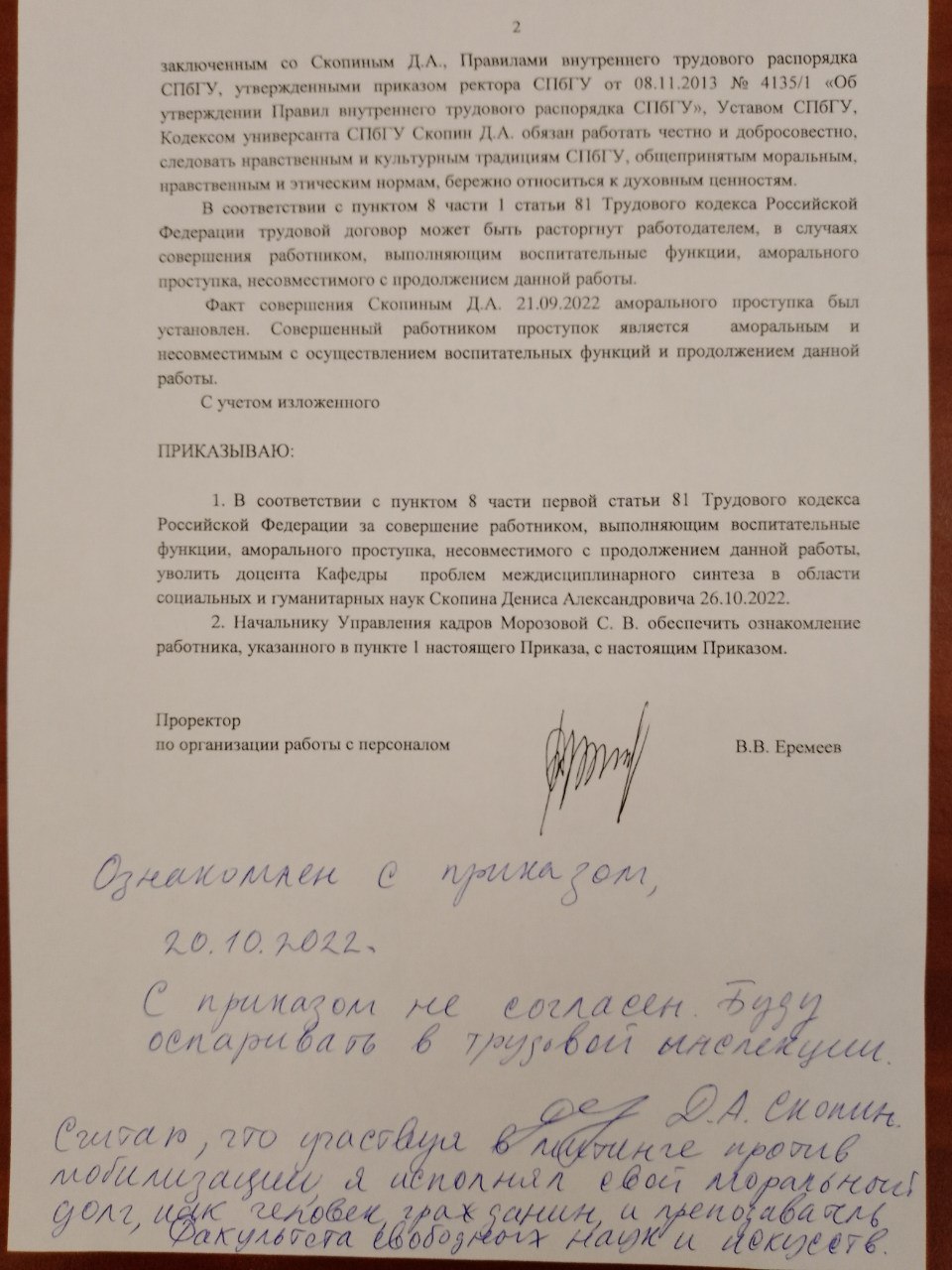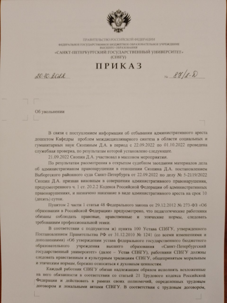 Дениса Скопина задержали на митинге против мобилизации, а позднее осудили по административной статье. После в СПбГУ по этому факту провели служебную проверку, итогом которой стало решение уволить Скопина 26 октября.