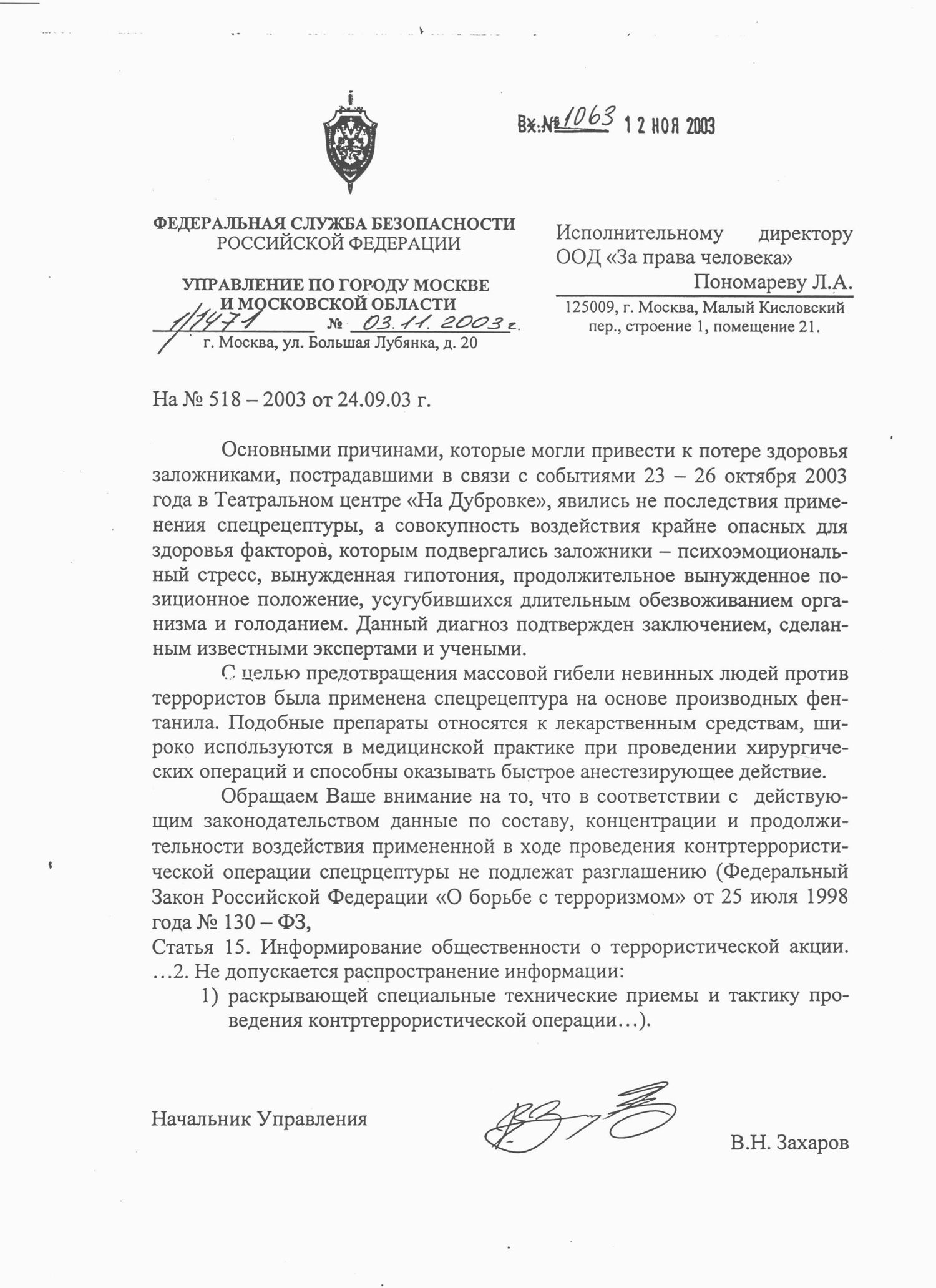 [Главный врач Москвы в то время Андрей] Сельцовский утверждает, что ему информация о применении спецсредства поступила за три минуты до выноса первых тел. Господин Шевченко [в то время министр здравоохранения] утверждает, что все знал, была приготовлена тысяча доз антидота. Какого «антидота», уважаемый?