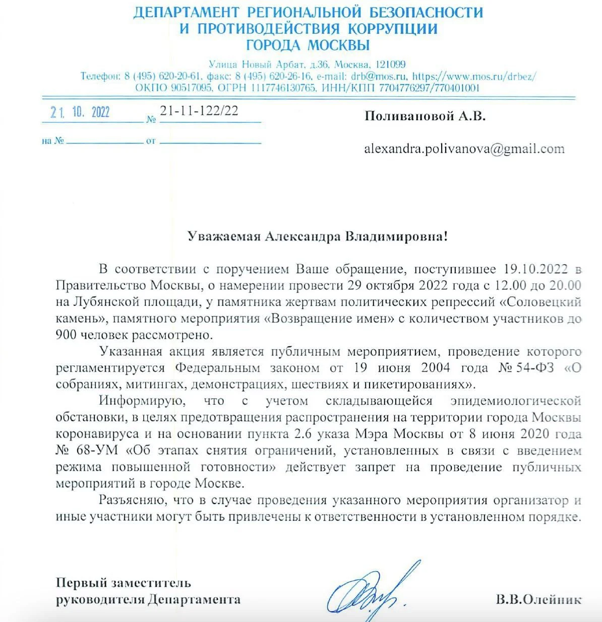 Департамент региональной безопасности Москвы отказал «Мемориалу» в проведении ежегодной акции в память жертв политических репрессий «Возвращение имен». Об этом общество рассказало в своем телеграм-канале.