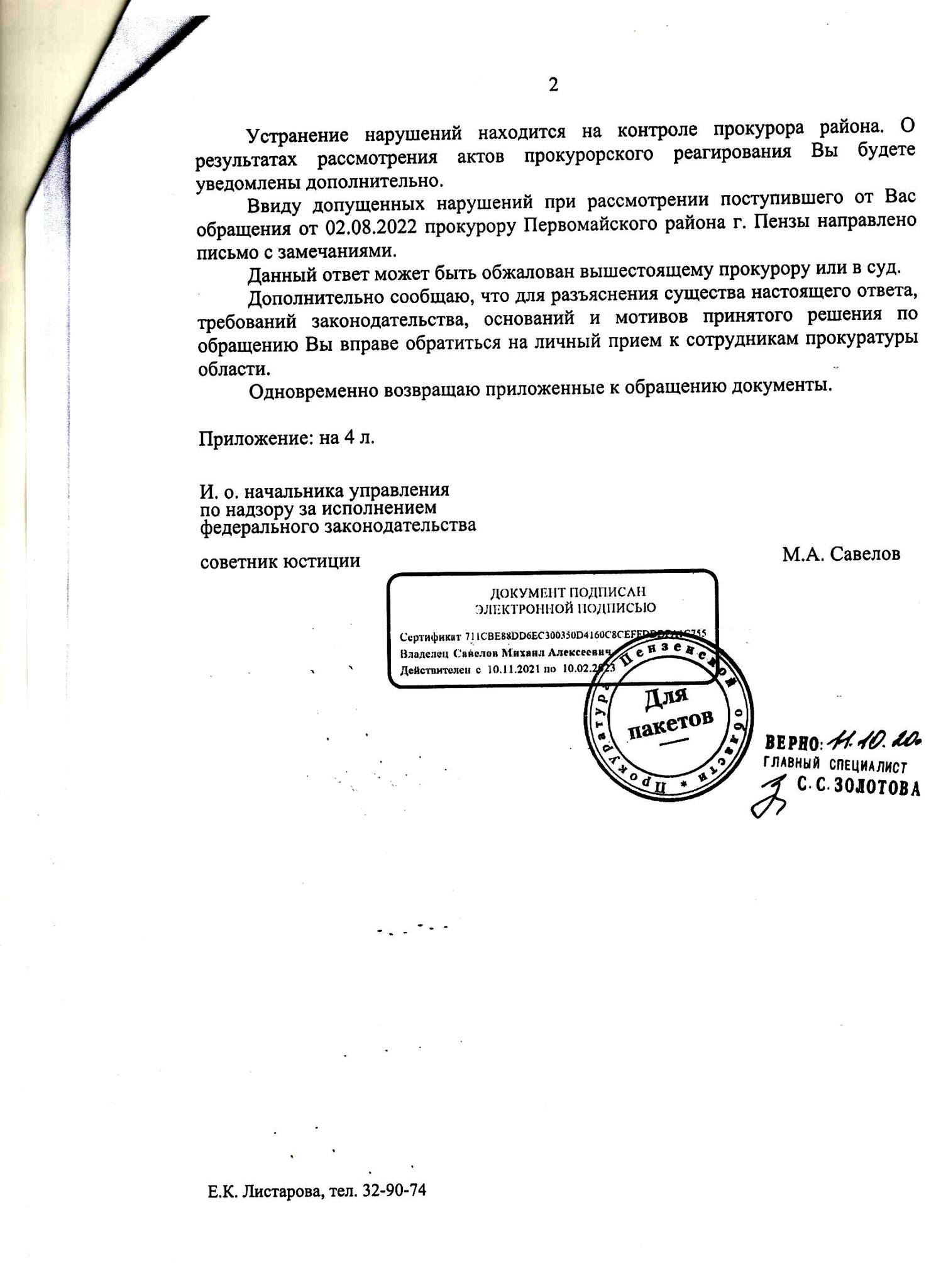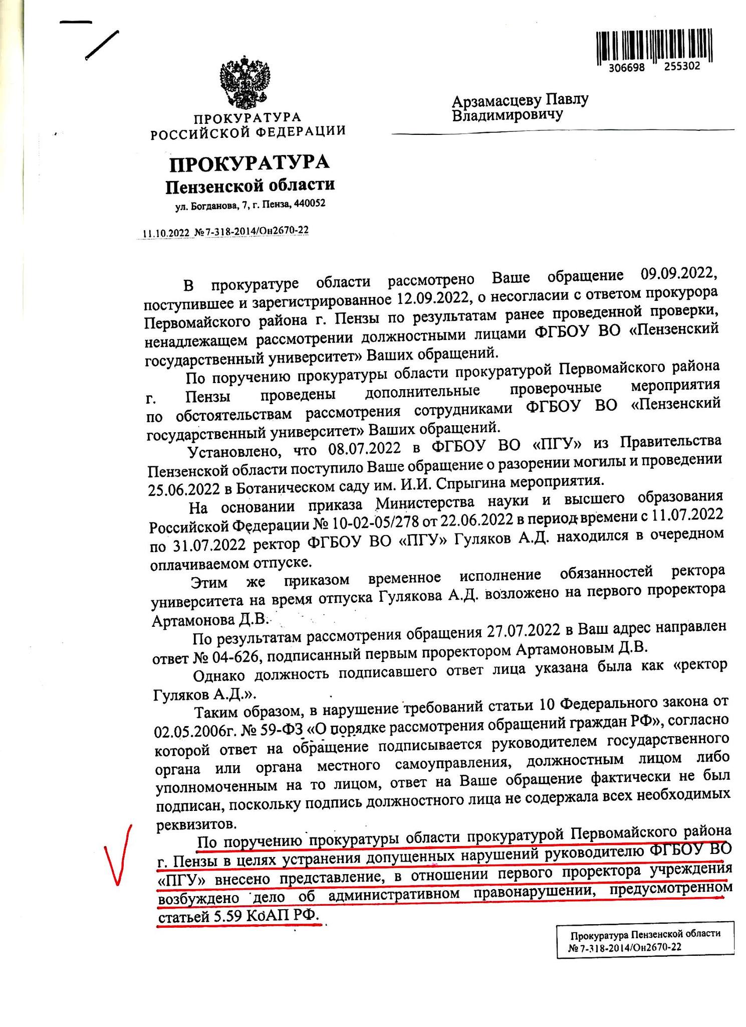Прокуратурой Первомайского района возбуждено еще одно дело по статье 5.59 КоАП («Нарушение порядка рассмотрения обращений граждан») против руководства Пензенского государственного университета. Причем – после замечания прокурору Первомайского района от областного прокурора.