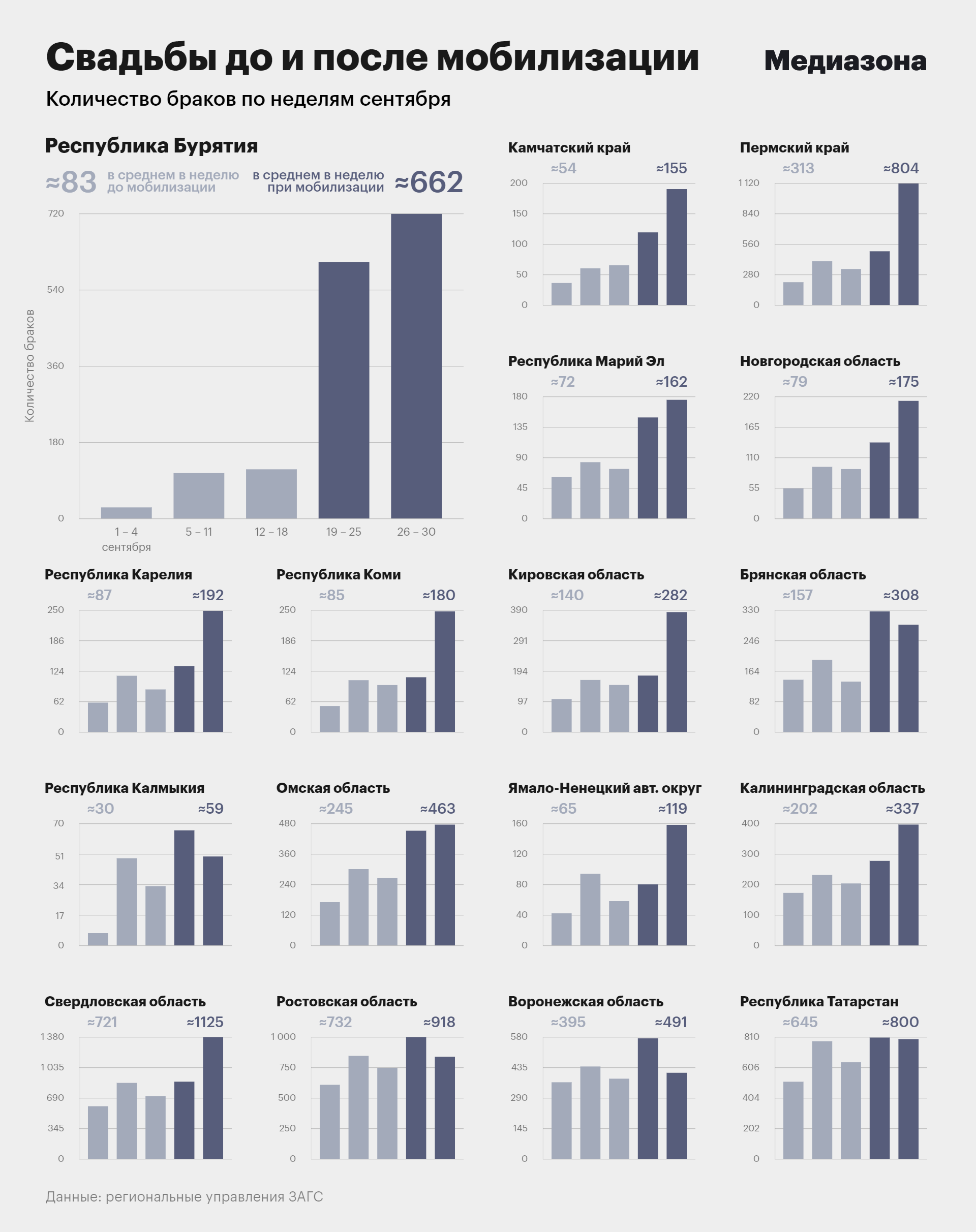 Рост числа браков после объявления мобилизации хорошо заметен на примере Бурятии. Это единственный российский регион, в котором загс каждый день публикует статистику за прошедшие сутки. С 1 по 21 сентября бурятские загсы в среднем регистрировали 83 свадьбы в неделю, а после 21-го — 662.