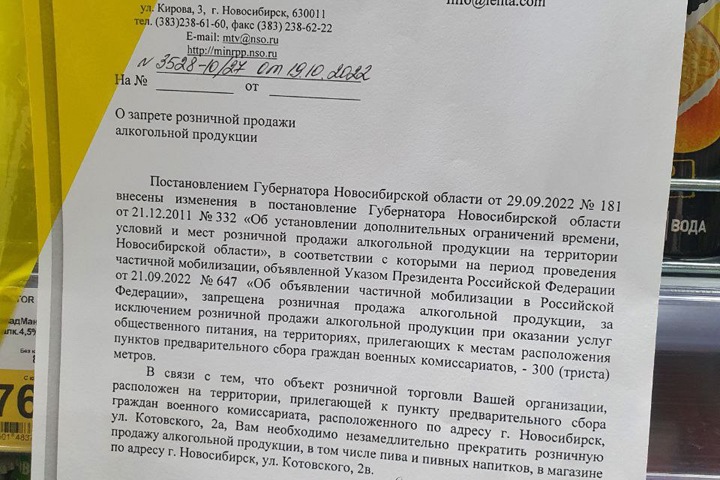 Предписание именно этой «Ленте» подписано министром промышленности региона Андреем Гончаровым и датировано 19 октября. Частичный сухой закон под предлогом мобилизации был введен в Новосибирске еще 1 октября (для Академгородка — в 1 км от НВВКУ, для остальных территорий — в 300 метрах от военкоматов).