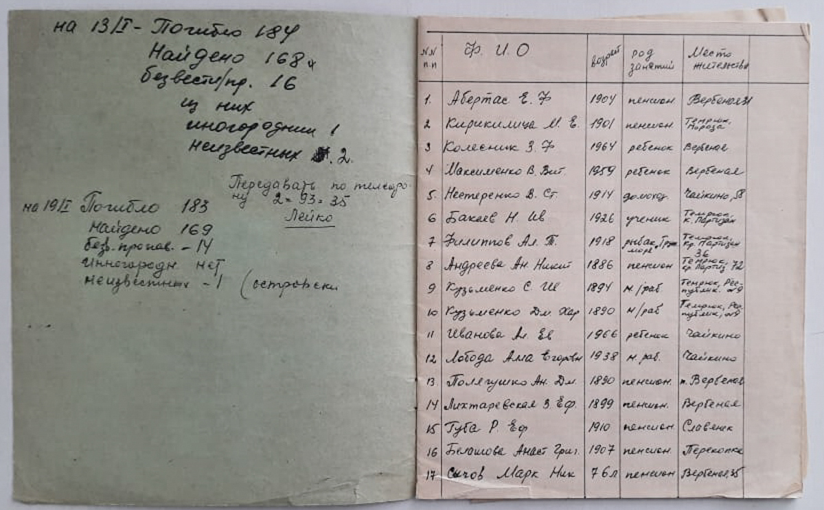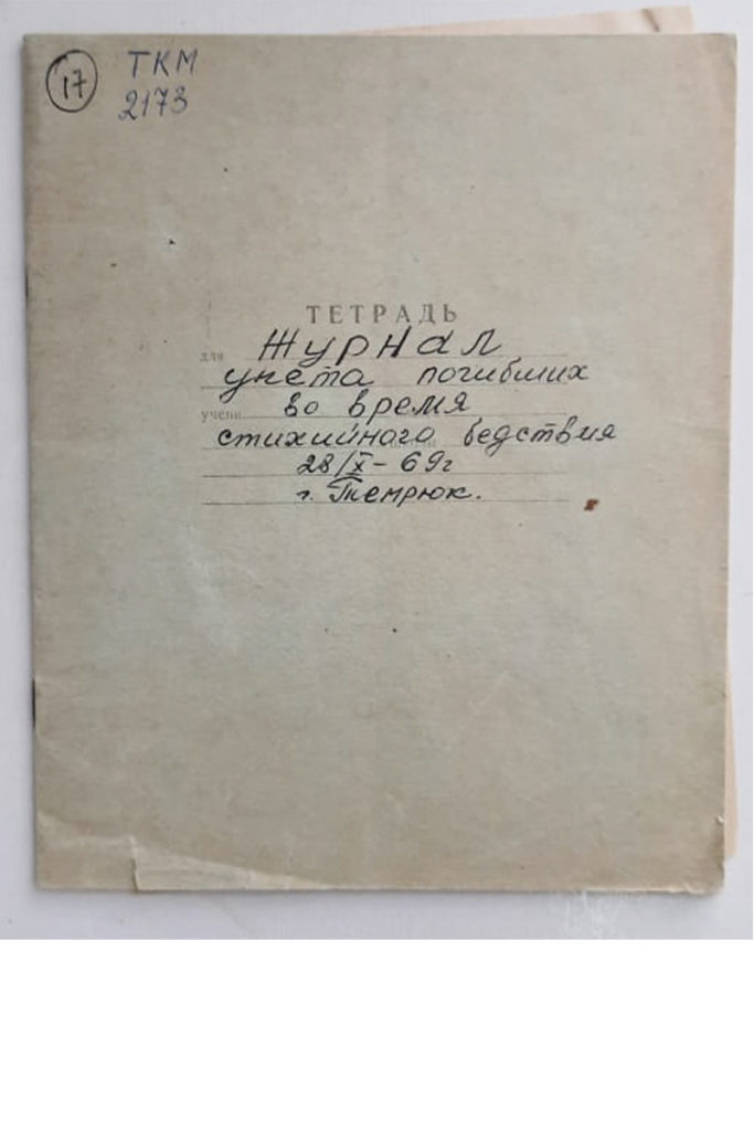 Тетрадь учета погибших. Снимок предоставлен Темрюкским музеем https://takiedela.ru/wp-content/uploads/2022/10/04-Taisiya-Alekseevna.mp3 О том, как искали с отрядами людей после наводнения, как висела на чашечках электропроводов морская трава после ухода воды, как находили скрученными и разбросанными железнодорожные рельсы, рассказал Александр Лукич, бывший тогда участковым уполномоченным в Темрюкском районе.